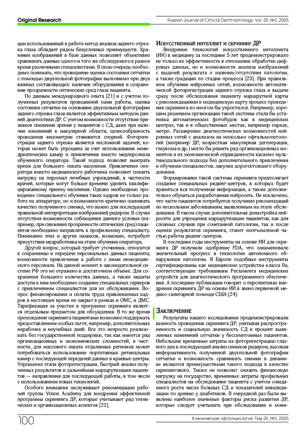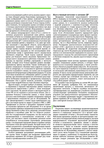 21. Yu D., Dou X., Chen J. et al. Two-field non-mydriatic fundus photography for diabetic retinopathy screening: a protocol for a systematic review and meta-analysis. BMJ Open. 2021;11(10):e051761. DOI: 10.1136/bmjopen-2021-051761
