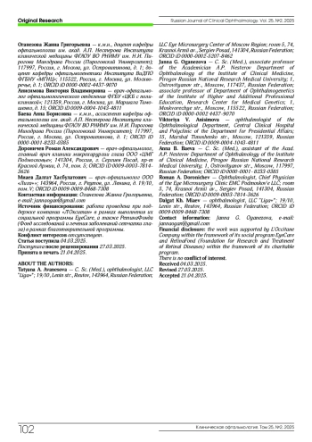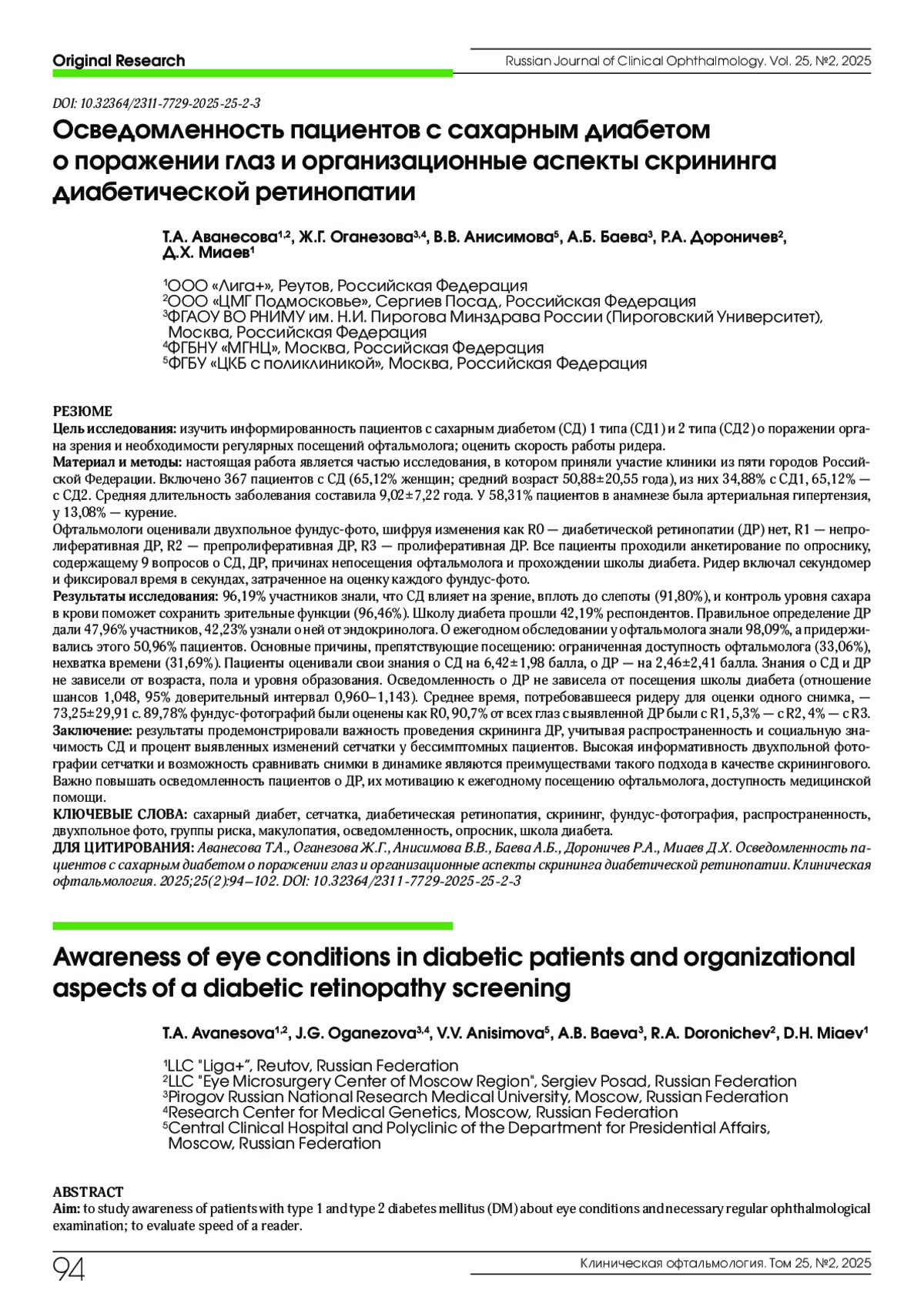 Avanesova T.A., Oganezova J.G., Anisimova V.V. et al. Two-field mydriatic fundus photography to assess the prevalence of macular disorder in diabetes.Russian Journal of Clinical Ophthalmology. 2024;24(3):102-108 (in Russ.). DOI: 10.32364/2311-7729-202424-3-1