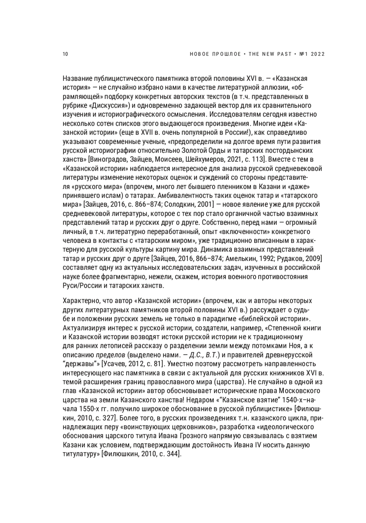 Название публицистического памятника второй половины XVI в. — «Казанская история» — не случайно избрано нами в качестве литературной аллюзии, «обрамляющей» подборку конкретных авторских текстов (в т. ч. представленных в рубрике «Дискуссия») и одновременно задающей вектор для их сравнительного изучения и историографического осмысления. Исследователям сегодня известно несколько сотен списков этого выдающегося произведения. Многие идеи «Казанской истории» (еще в XVII в. очень популярной в России!), как справедливо указывают современные ученые, «предопределили на долгое время пути развития русской историографии относительно Золотой Орды и татарских постордынских ханств» [Виноградов, Зайцев, Моисеев, Шейхумеров, 2021, с. 113].
