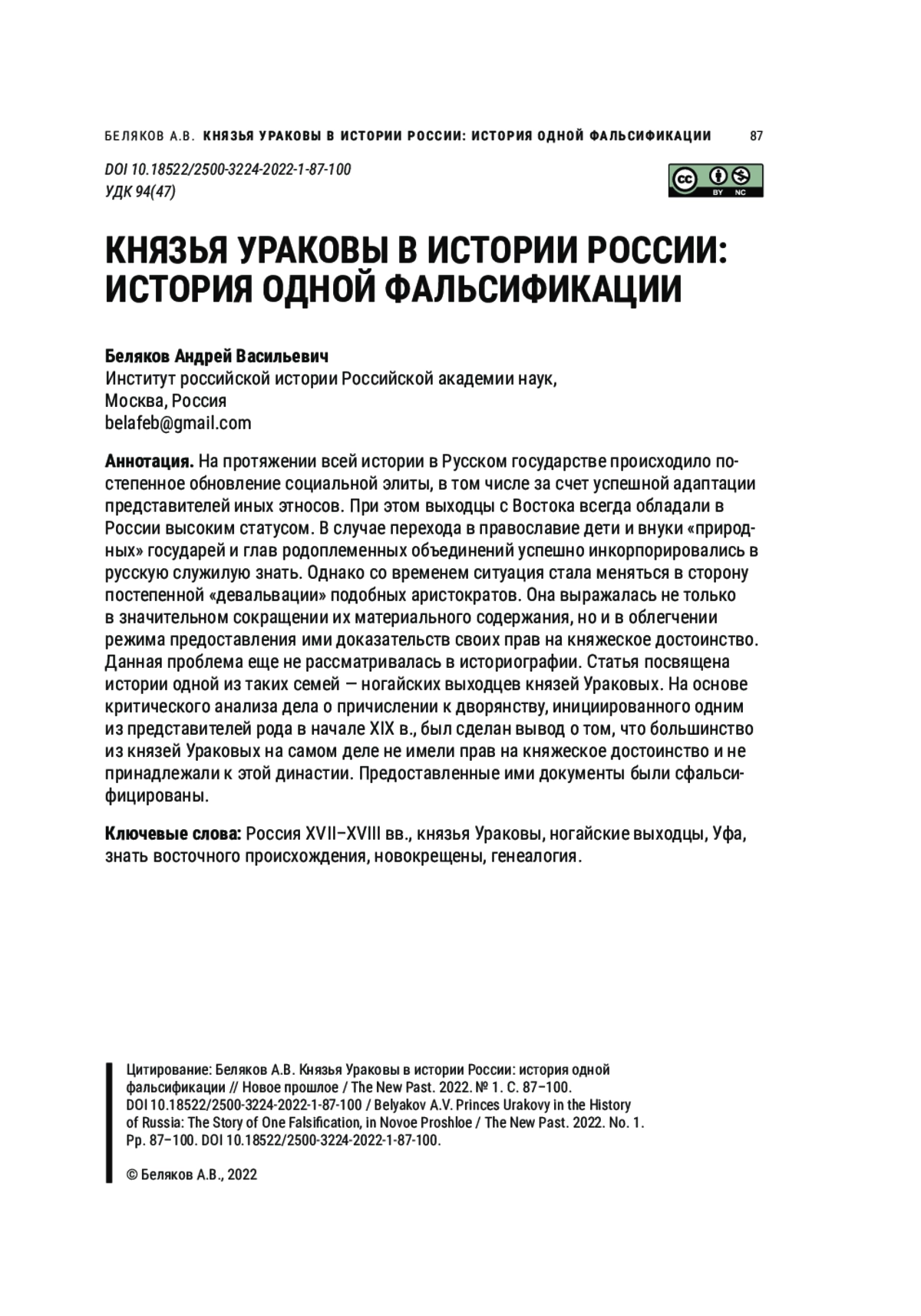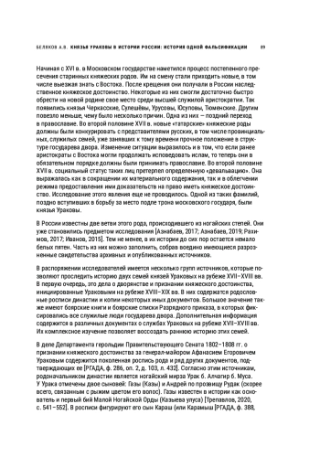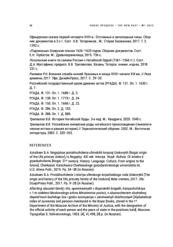 На протяжении всей истории в Русском государстве происходило постепенное обновление социальной элиты, в том числе за счет успешной адаптации представителей иных этносов. При этом выходцы с Востока всегда обладали в России высоким статусом. В случае перехода в православие дети и внуки «природных» государей и глав родоплеменных объединений успешно инкорпорировались в русскую служилую знать. Однако со временем ситуация стала меняться в сторону постепенной «девальвации» подобных аристократов. Она выражалась не только в значительном сокращении их материального содержания, но и в облегчении режима предоставления ими доказательств своих прав на княжеское достоинство. Данная проблема еще не рассматривалась в историографии. Статья посвящена истории одной из таких семей — ногайских выходцев князей Ураковых. На основе критического анализа дела о причислении к дворянству, инициированного одним из представителей рода в начале XIX в., был сделан вывод о том, что большинство из князей Ураковых на самом деле не имели прав на княжеское достоинство и не принадлежали к этой династии. Предоставленные ими документы были сфальсифицированы.