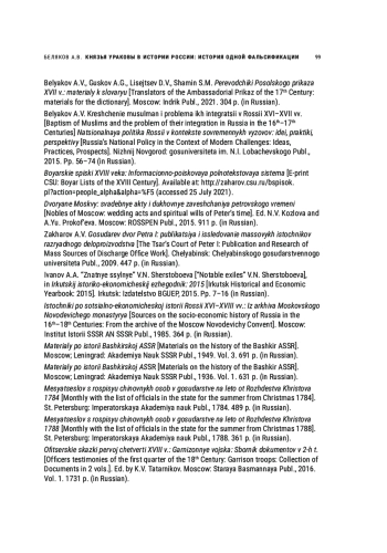 5. Беляков А.В. Крещение мусульман и проблема их интеграции в России XVI-XVII вв. // Национальная политика России в контексте современных вызовов: идеи, практики, перспективы. Нижний Новгород: Изд-во госуниверситета им. Н.И. Лобачевского, 2015. С. 56-74.