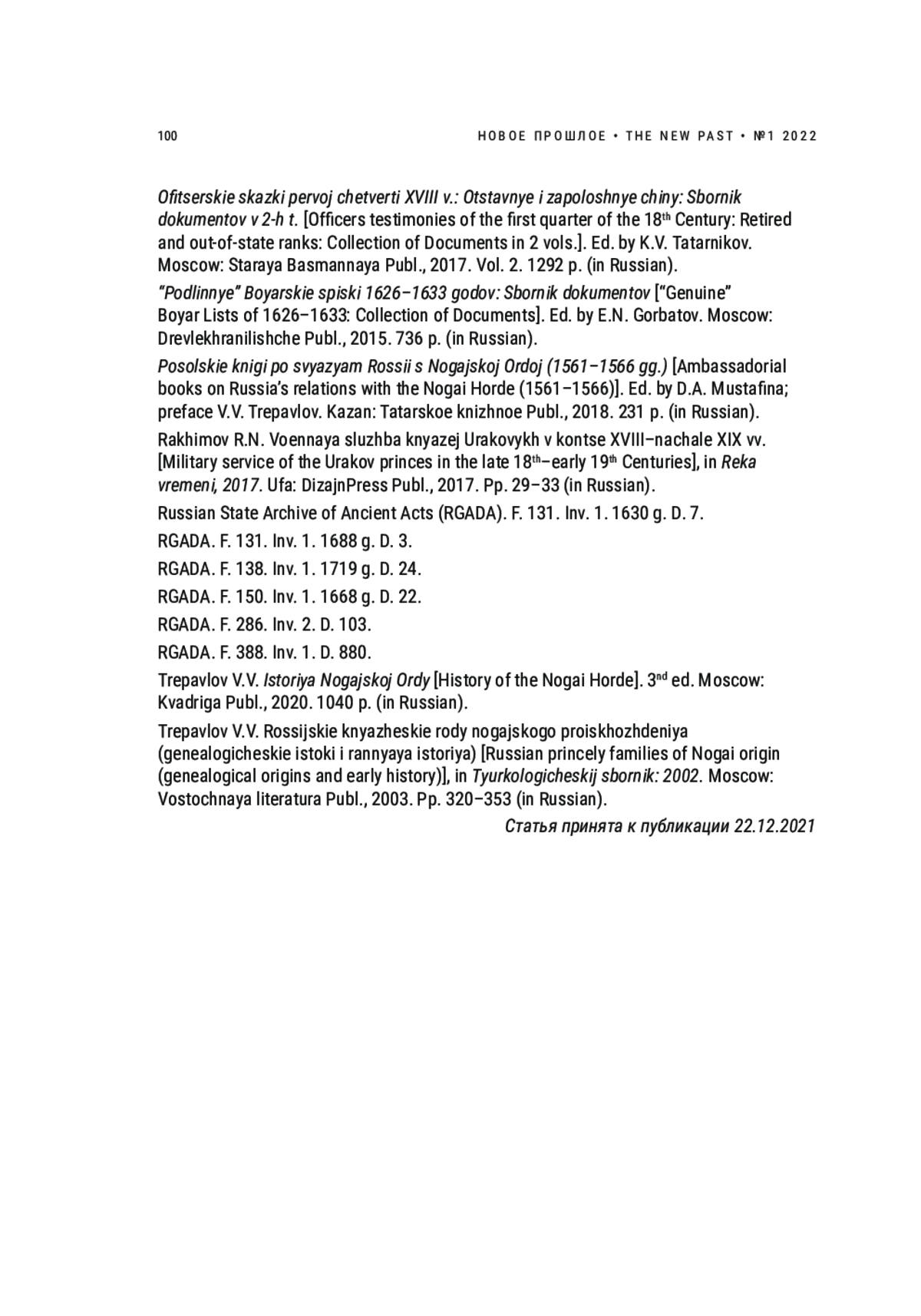 27. Трепавлов В.В. Российские княжеские роды ногайского происхождения (генеалогические истоки и ранняя история) // Тюркологический сборник: 2002. М.: Восточная литература, 2003. С. 320-353. EDN: WLBRSP