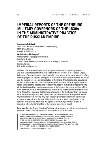 В статье рассматриваются всеподданнейшие отчеты оренбургских военных губернаторов и их роль в конструировании административной практики Российской империи. Актуальность выбранной темы определяется тем, что отчеты главных начальников Оренбургского края, ставшие важнейшим каналом коммуникации между центром и регионами, специально не изучались. Хронологические рамки работы включают 1830-е гг., когда составление отчетов стало устойчивой административной практикой. Источниковую базу исследования составили всеподданнейшие отчеты оренбургских военных губернаторов, отложившиеся в фондах центральных архивов, делопроизводственные материалы, многие из которых впервые вводятся в научный оборот. Авторы приходят к выводам, что всеподданнейшие отчеты оренбургских военных губернаторов отражали все предметы их ведения: гражданское, военно-пограничное управление. В отличие от ежегодных губернаторских отчетов, они носили «надведомственный» характер, представляли собой комплексный взгляд на состояние Оренбургского края с четкой фиксацией его специфики и особенностей. В силу этого отчеты военных губернаторов играли особенную роль в конструировании модели регионального управления