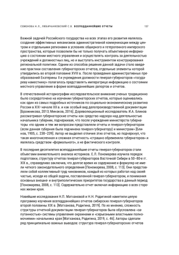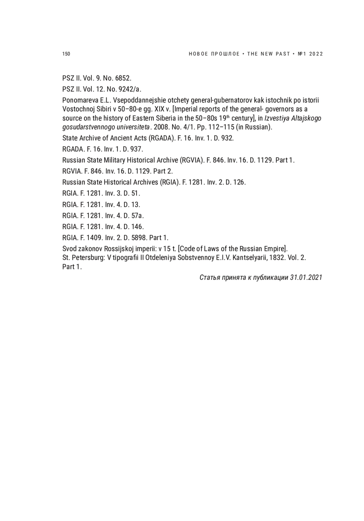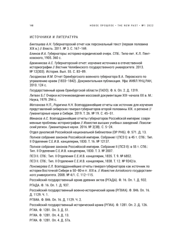 7. Матханова Н.П., Родигина Н.Н. Всеподданнейшие отчеты как источник для изучения представлений сибирских генерал-губернаторов второй половины XIX. о регионе // Гуманитарные науки в Сибири. 2019. Т. 26. № 19. С. 45-51.