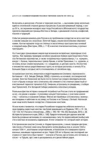 Включаясь в дискуссию «Россия и тюркские ханства…», выскажем сразу несколько идей по этнической стороне данных процессов. В рассматриваемый период, с конца XV в., по окраинам молодого еще тогда Российского (Московского) государства пролегла евразийская граница Востока и Запада, с динамикой этносов, конфессий, языков и традиций