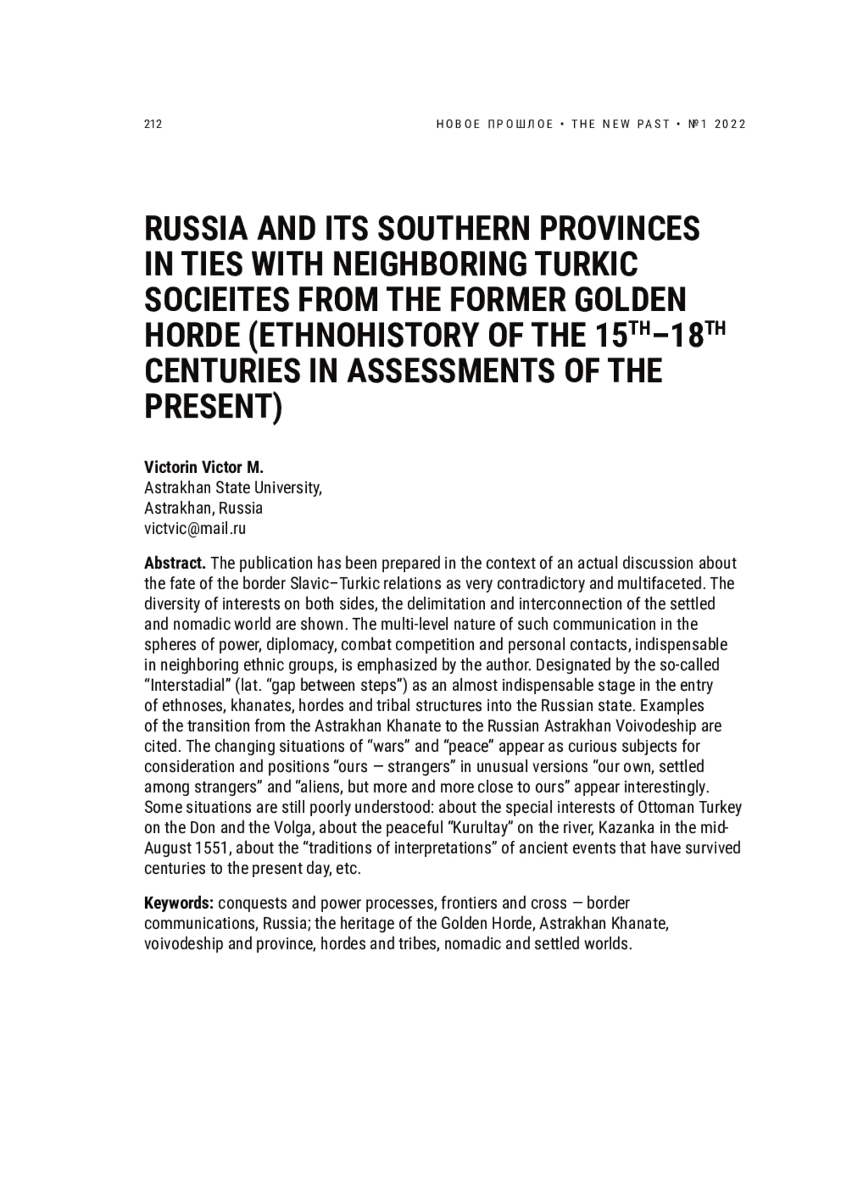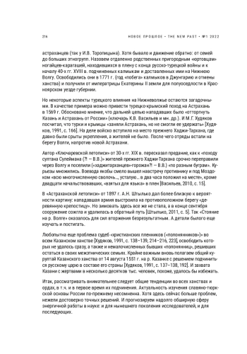Публикация подготовлена в плане актуальной дискуссии о судьбах приграничных славяно-тюркских взаимоотношений как очень противоречивых и многогранных. Показаны разноплановость интересов с обеих сторон, разграничение и взаимосвязь оседлого и кочевого мира. Обозначен т. н. «интерстадиал» (лат. «зазор между ступенями») как практически непременный этап вхождения ханств, орд и родоплеменных структур в состав Российского государства. Подчеркнут разноуровневый характер общения в сферах власти и дипломатии, боевой конкуренции и в личных контактах, непременных в соседних этносах. Привлечены примеры перехода от Астраханского ханства к российскому Астраханскому воеводству. Как любопытные предметы для рассмотрения предстают менявшие друг друга ситуации «войн» и «мира», положения «свои — чужие» в необычных вариантах «свои, осевшие среди чужих» и «чужие, но все более близкие к своим». Некоторые ситуации пока еще малоизучены: об особых интересах Османской Турции на Дону и на Волге, о мирном курултае на р. Казанке в середине августа 1551 г., о традициях трактовок давних событий, переживших столетия до наших дней и др