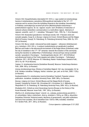 2. Викторин В.М. Этнополитический интерстадиал XVI-XVII вв. и его носители (от Астраханского ханства к Астраханскому воеводству) // Проблемы взаимодействия национальных культур (Межэтнические общения в полиэтническом регионе). Сб. тез. регионал. научн. конф. Ч. I. Астрахань: Общ-во и издат-во “Этнополис”, 1995. С. 7-8.