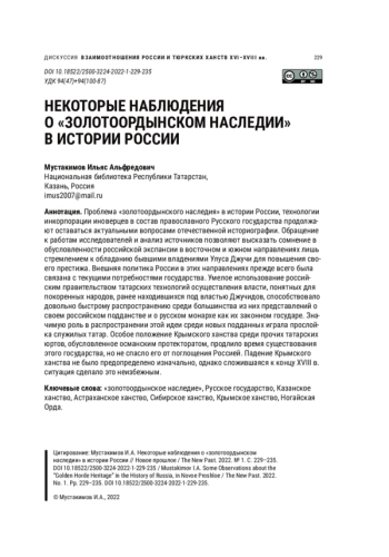 Проблема «золотоордынского наследия» в истории России, технологии инкорпорации иноверцев в состав православного Русского государства продолжают оставаться актуальными вопросами отечественной историографии. Обращение к работам исследователей и анализ источников позволяют высказать сомнение в обусловленности российской экспансии в восточном и южном направлениях лишь стремлением к обладанию бывшими владениями Улуса Джучи для повышения своего престижа. Внешняя политика России в этих направлениях прежде всего была связана с текущими потребностями государства. Умелое использование российским правительством татарских технологий осуществления власти, понятных для покоренных народов, ранее находившихся под властью Джучидов, способствовало довольно быстрому распространению среди большинства из них представлений о своем российском подданстве и о русском монархе как их законном государе. Значимую роль в распространении этой идеи среди новых подданных играла прослойка служилых татар. Особое положение Крымского ханства среди прочих татарских юртов, обусловленное османским протекторатом, продлило время существования этого государства, но не спасло его от поглощения Россией. Падение Крымского ханства не было предопределено изначально, однако сложившаяся к концу XVIII в. ситуация сделало это неизбежным