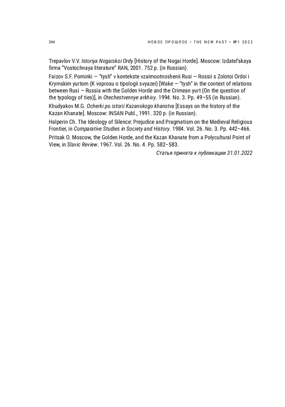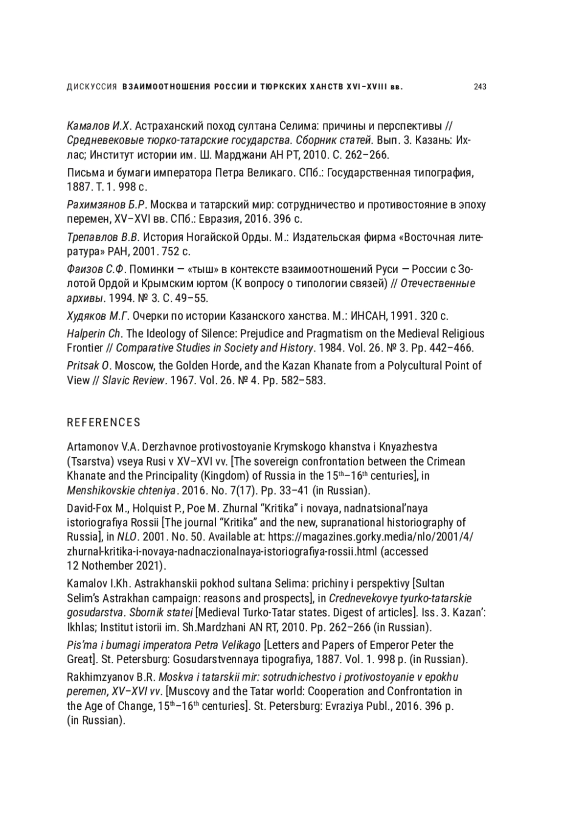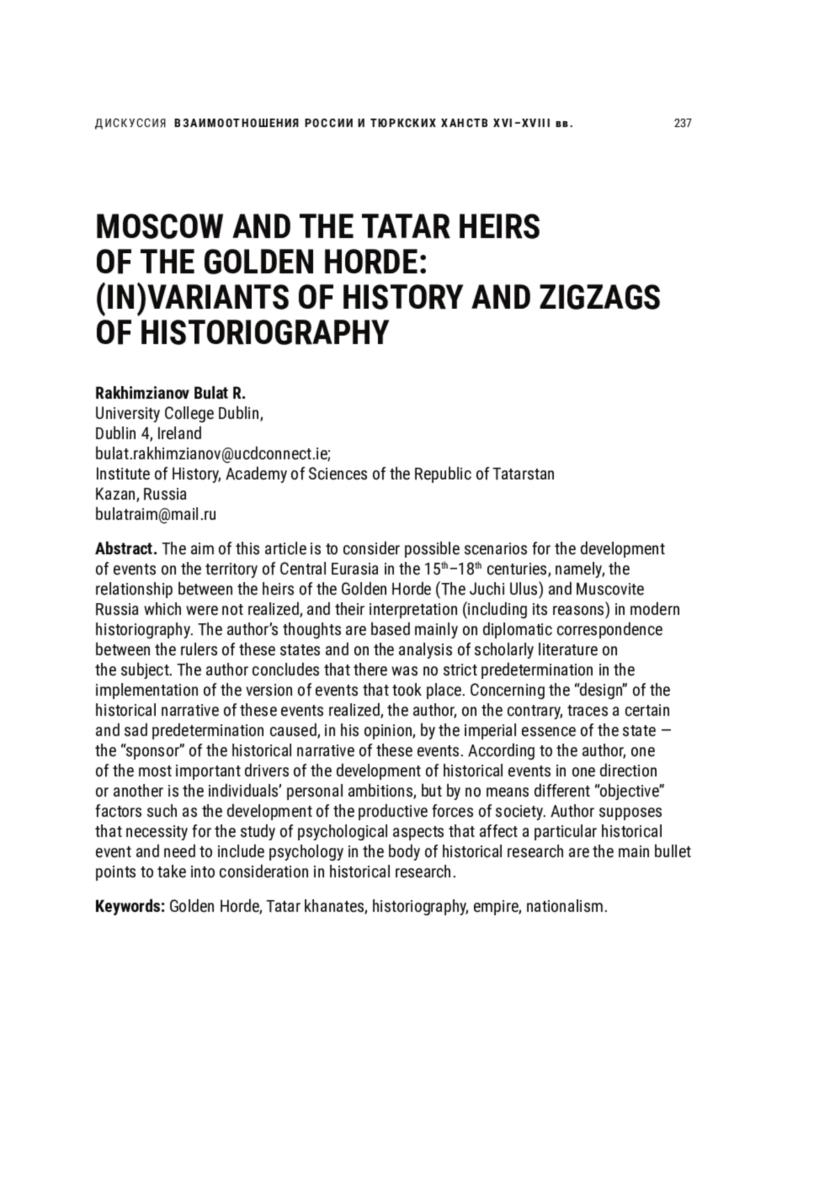 Статья: МОСКВА И ТАТАРСКИЕ НАСЛЕДНИКИ ЗОЛОТОЙ ОРДЫ: (ИН)ВАРИАНТЫ ИСТОРИИ И ЗИГЗАГИ ИСТОРИОГРАФИИ (2022)