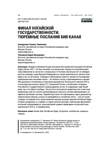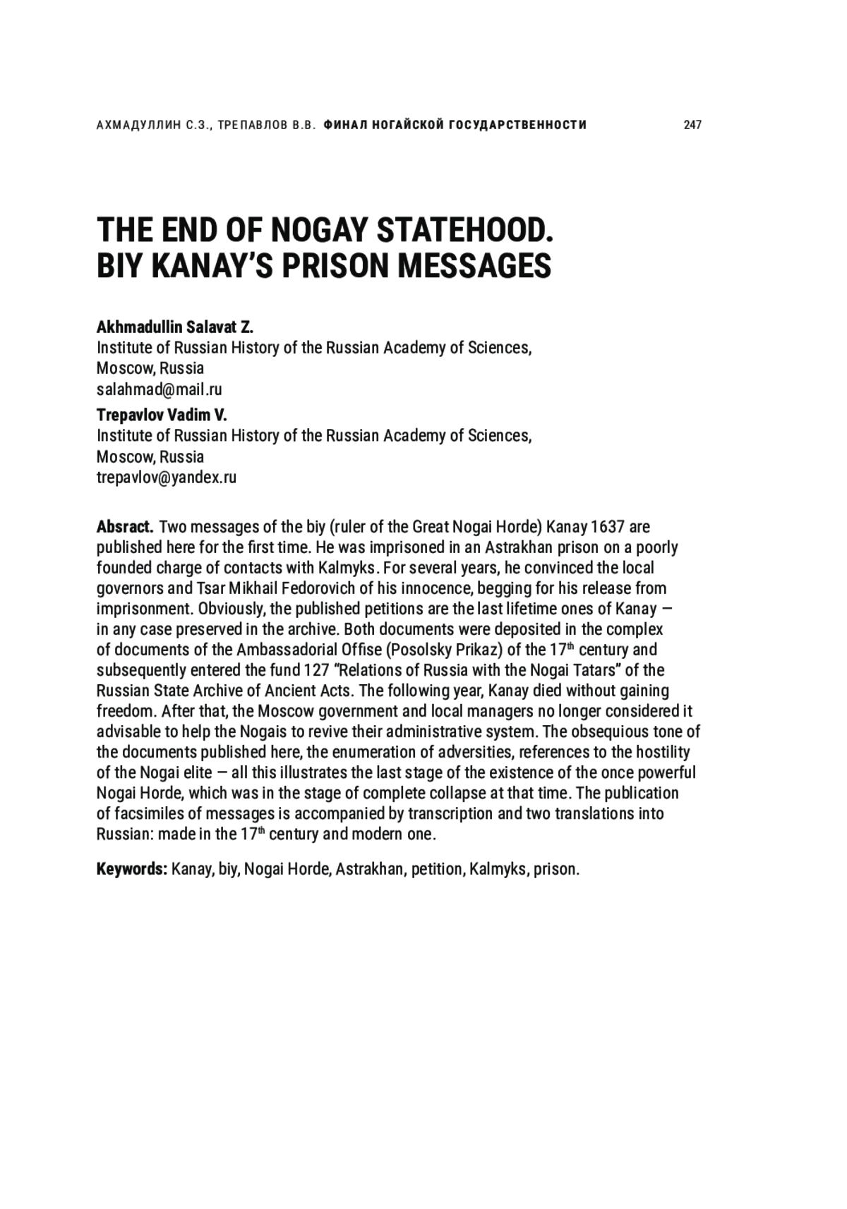 Впервые публикуются два послания бия (правителя Большой Ногайской Орды) Каная 1637 г. Он был посажен в астраханскую тюрьму по малообоснованному обвинению в контактах с калмыками. В течение нескольких лет он убеждал местных воевод и царя Михаила Федоровича в своей невиновности, умоляя освободить его из заточения. Очевидно, публикуемые грамоты являются последними прижизненными письмами Каная — во всяком случае, сохранившимися в архиве. Оба документа отложились в комплексе документов Посольского приказа XVII в. и впоследствии вошли в фонд 127 «Сношения России с ногайскими татарами» Российского государственного архива древних актов. В следующем году Канай умер, так и не обретя свободы. После этого московское правительство и местные управленцы уже не считали целесообразным помогать ногаям реанимировать их административную систему. Подобострастный тон публикуемых здесь документов, перечисление невзгод, ссылки на враждебность ногайской элиты — все это иллюстрирует последний этап существования некогда могущественной Ногайской Орды, которая находилась в то время в стадии полного распада. Публикация факсимиле посланий сопровождается транскрипцией и двумя переводами на русский язык: сделанным в XVII в. и современным.