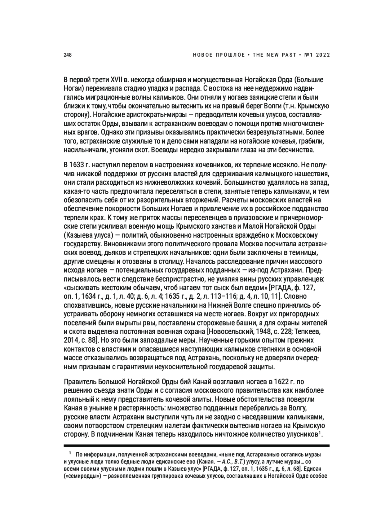 Публикация подготовлена в плане актуальной дискуссии о судьбах приграничных славяно-тюркских взаимоотношений как очень противоречивых и многогранных. Показаны разноплановость интересов с обеих сторон, разграничение и взаимосвязь оседлого и кочевого мира. Обозначен т. н. «интерстадиал» (лат. «зазор между ступенями») как практически непременный этап вхождения ханств, орд и родоплеменных структур в состав Российского государства. Подчеркнут разноуровневый характер общения в сферах власти и дипломатии, боевой конкуренции и в личных контактах, непременных в соседних этносах. Привлечены примеры перехода от Астраханского ханства к российскому Астраханскому воеводству. Как любопытные предметы для рассмотрения предстают менявшие друг друга ситуации «войн» и «мира», положения «свои — чужие» в необычных вариантах «свои, осевшие среди чужих» и «чужие, но все более близкие к своим». Некоторые ситуации пока еще малоизучены: об особых интересах Османской Турции на Дону и на Волге, о мирном курултае на р. Казанке в середине августа 1551 г., о традициях трактовок давних событий, переживших столетия до наших дней и др