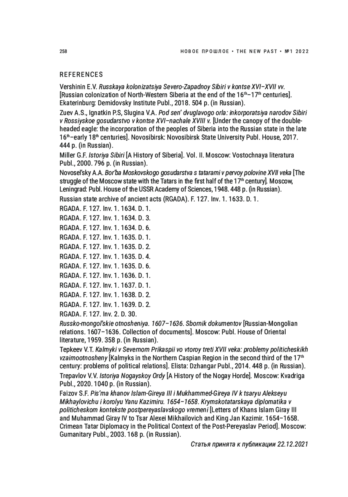 1. Вершинин Е.В. Русская колонизация Северо-Западной Сибири в конце XVI-XVII вв. Екатеринбург: Демидовский институт, 2018. 504 с. EDN: OGZOCQ