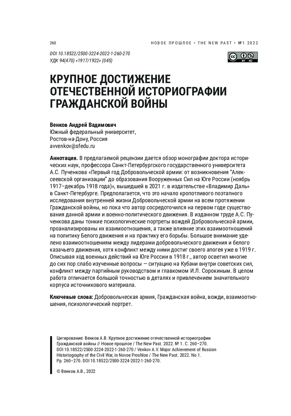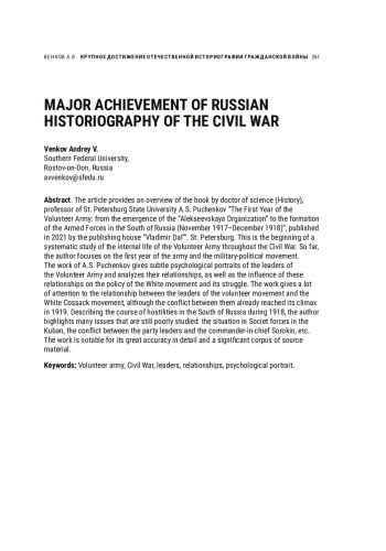 В предлагаемой рецензии дается обзор монографии доктора исторических наук, профессора Санкт-Петербургского государственного университета А. С. Пученкова «Первый год Добровольческой армии: от возникновения “Алексеевской организации” до образования Вооруженных Сил на Юге России (ноябрь 1917–декабрь 1918 года)», вышедшей в 2021 г. в издательстве «Владимир Даль» в Санкт-Петербурге. Предполагается, что это начало кропотливого поэтапного исследования внутренней жизни Добровольческой армии на всем протяжении Гражданской войны, но пока что автор сосредоточился на первом годе существования данной армии и военно-политического движения. В изданном труде А. С. Пученкова даны тонкие психологические портреты вождей Добровольческой армии, проанализированы их взаимоотношения, а также влияние этих взаимоотношений на политику Белого движения и на практику его борьбы. Большое внимание уделено взаимоотношениям между лидерами добровольческого движения и белого казачьего движения, хотя конфликт между ними достиг своего апогея уже в 1919 г. Описывая ход военных действий на Юге России в 1918 г., автор осветил многие до сих пор слабо изученные вопросы — ситуацию на Кубани внутри советских сил, конфликт между партийным руководством и главкомом И. Л. Сорокиным. В целом работа отличается большой точностью в деталях и привлечением значительного корпуса источникового материала