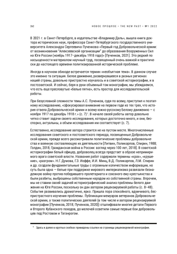 В 2021 г. в Санкт-Петербурге, в издательстве «Владимир Даль», вышла книга доктора исторических наук, профессора Санкт-Петербургского государственного университета Александра Сергеевича Пученкова «Первый год Добровольческой армии: от возникновения “Алексеевской организации” до образования Вооруженных Сил на Юге России (ноябрь 1917–декабрь 1918 года)» [Пученков, 2021]. Это редкий по насыщенности материалом научный труд, посвященный очень важной и практически до настоящего времени политизированной исторической проблеме.