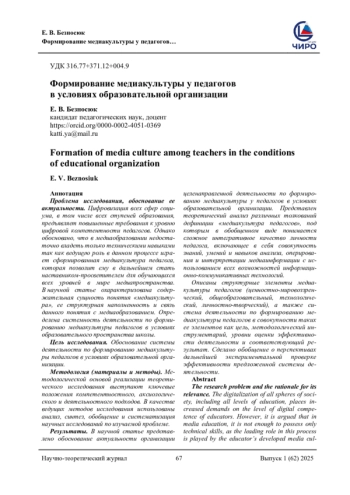 Проблема исследования, обоснование ее актуальности. Цифровизация всех сфер социума, в том числе всех ступеней образования, предъявляет повышенные требования к уровню цифровой компетентности педагогов. Однако обосновано, что в медиаобразовании недостаточно владеть только техническими навыками так как ведущую роль в данном процессе играет сформированная медиакультура педагога, которая позволит ему в дальнейшем стать наставником-просветителем для обучающихся всех уровней в мире медиапространства. В научной статье охарактеризована содержательная сущность понятия «медиакультура», ее структурная наполненность и связь данного понятия с медиаобразованием. Определена системность деятельности по формированию медиакультуры педагогов в условиях образовательного пространства школы. Цель исследования. Обоснование системы деятельности по формированию медиакультуры педагогов в условиях образовательной организации. Методология (материалы и методы). Методологической основой реализации теоретического исследования выступают ключевые положения компетентностного, аксиологического и деятельностного подходов. В качестве ведущих методов исследования использованы анализ, синтез, обобщение и систематизация научных исследований по изучаемой проблеме.