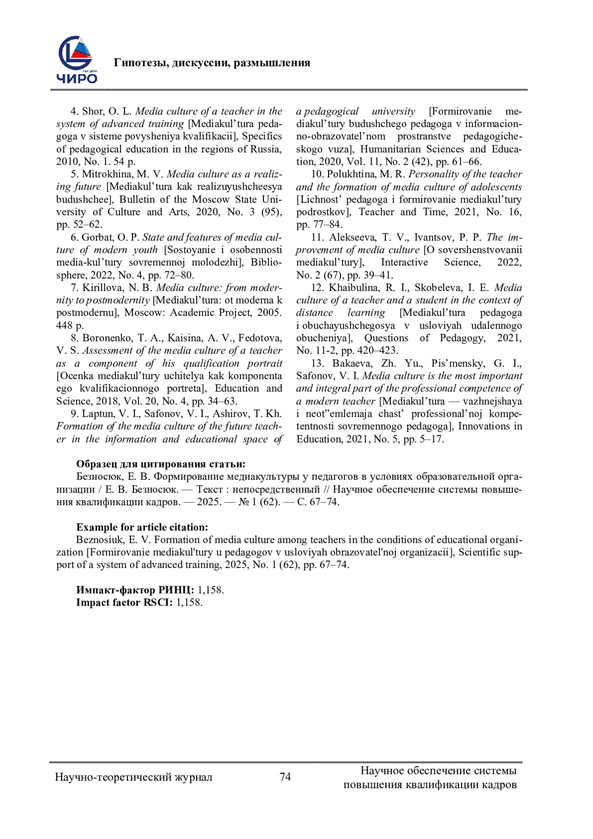 13. Бакаева, Ж. Ю. Медиакультура - важнейшая и неотъемлемая часть профессиональной компетентности современного педагога / Ж. Ю. Бакаева, Г. И. Письменский, В. И. Сафонов. - Текст: непосредственный // Инновации в образовании. - 2021. - № 5. - С. 5-17. EDN: INBZXD