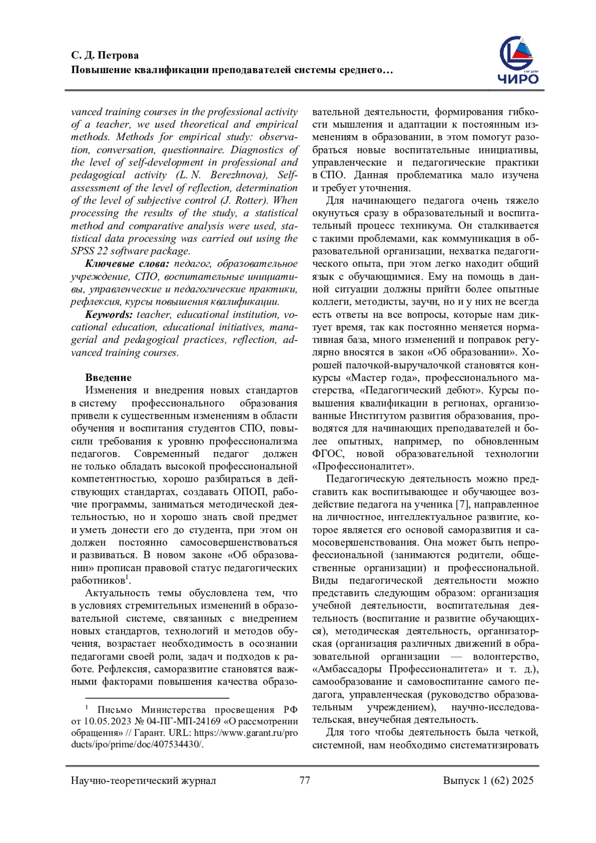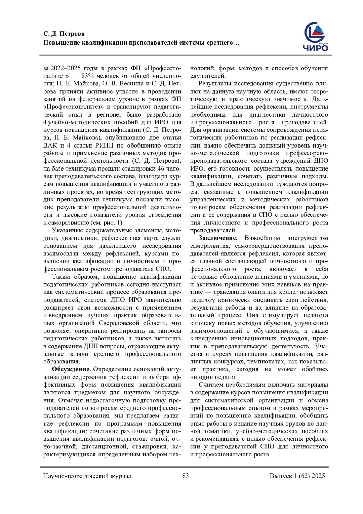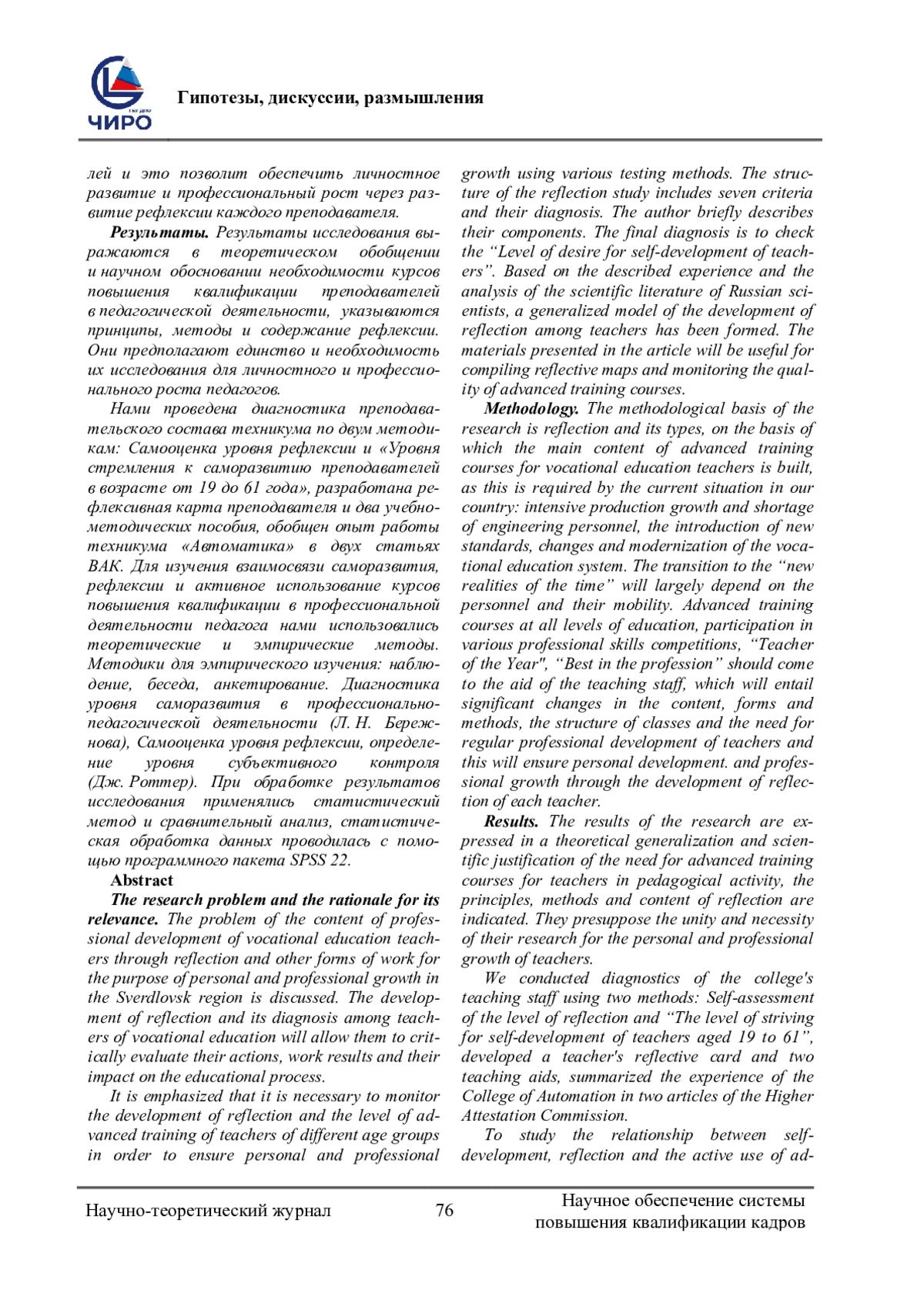 Проблема исследования и обоснование ее актуальности. Обсуждается проблема содержания повышения квалификации преподавателей СПО посредством рефлексии и других форм работы с целью личностного и профессионального роста в Свердловской области. Развитие рефлексии и ее диагностика у преподавателей СПО позволит критически оценивать свои действия, результаты работы и их влияние на образовательный процесс. Подчеркивается необходимость отслеживания развития рефлексии и уровня повышения квалификации преподавателей разных возрастных групп с целью обеспечения личностного и профессионального роста с применением различных тестирующих методик. В структуру исследования рефлексии вошли семь критериев и их диагностика. Автор кратко описывает их составляющие. Итоговой диагностикой является проверка «Уровня стремления к саморазвитию преподавателей».