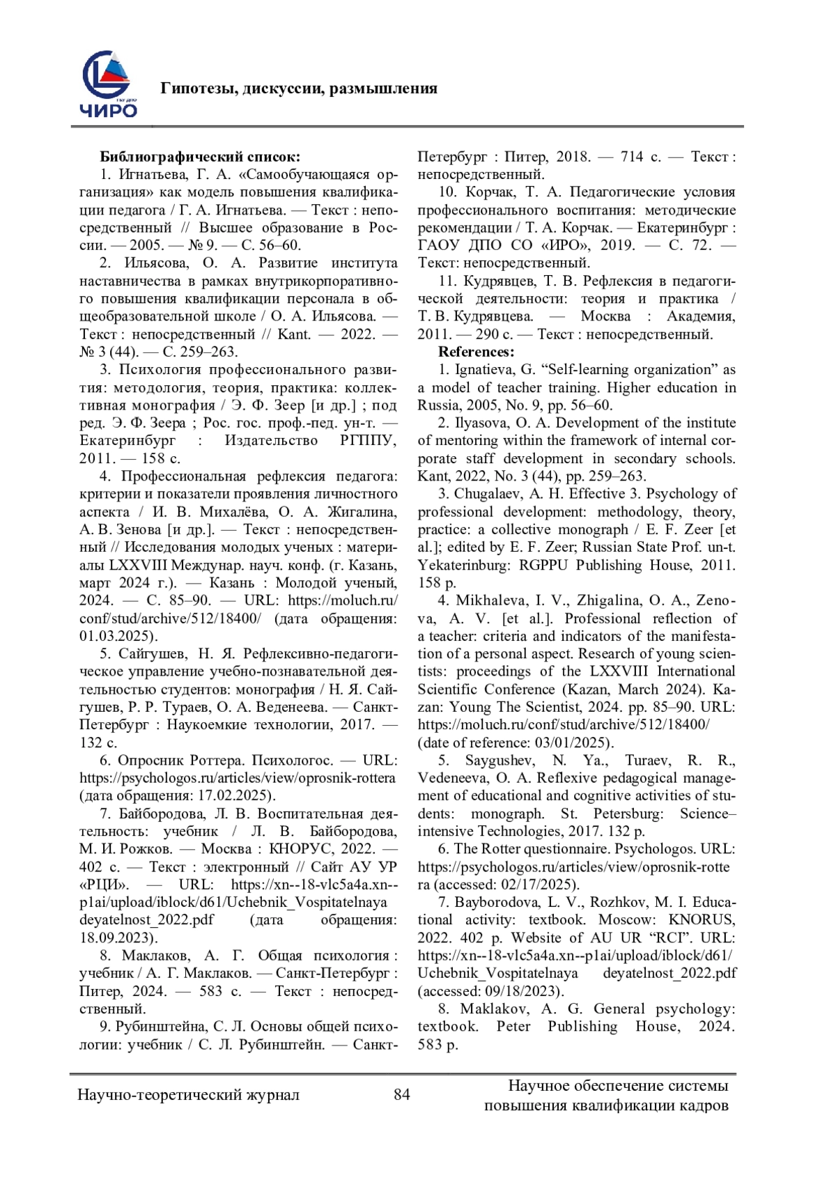 1. Игнатьева, Г. А. “Самообучающаяся организация” как модель повышения квалификации педагога / Г. А. Игнатьева. - Текст: непосредственный // Высшее образование в России. - 2005. - № 9. - С. 56-60. EDN: IBNGTH