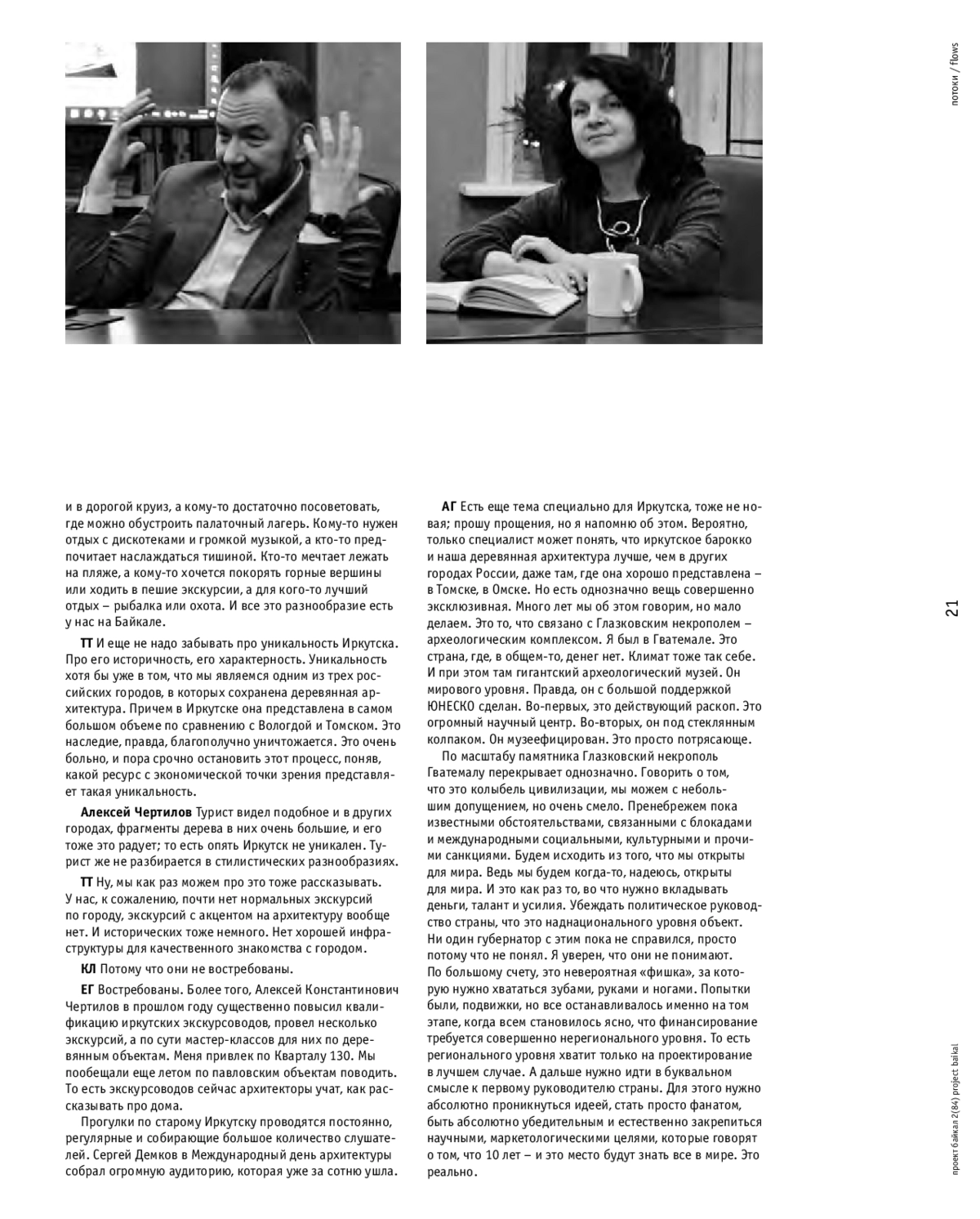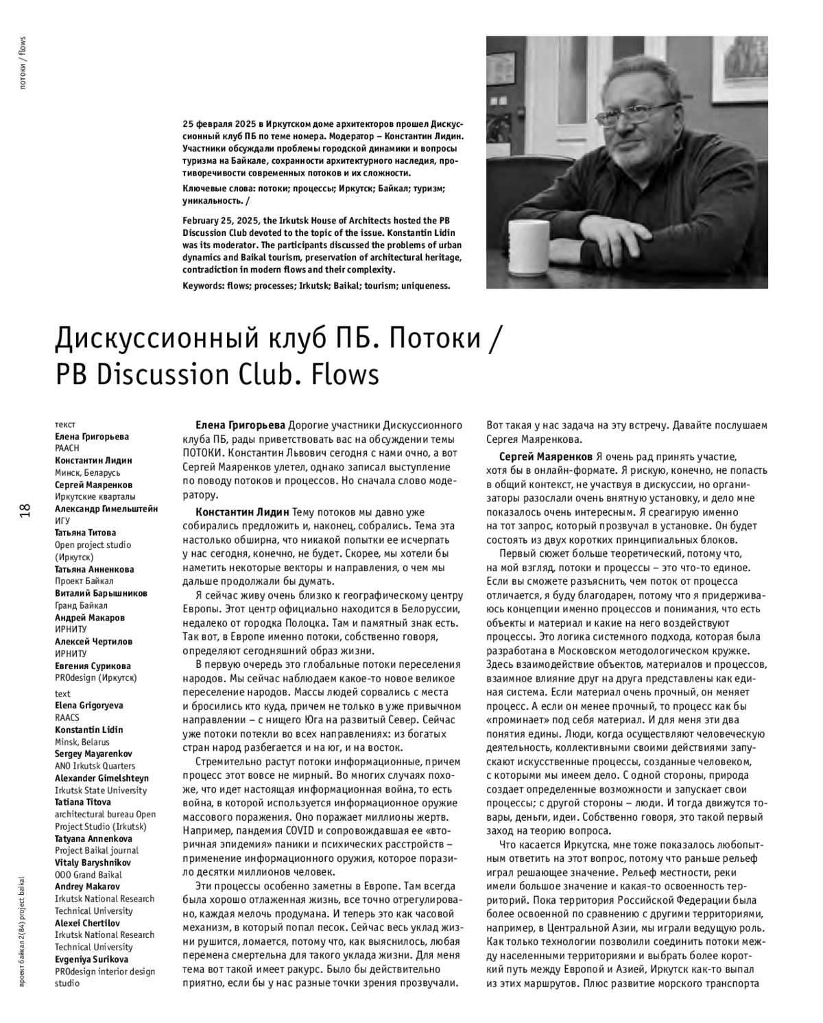 25 февраля 2025 в Иркутском доме архитекторов прошел Дискус‑ сионный клуб ПБ по теме номера. Модератор – Константин Лидин. Участники обсуждали проблемы городской динамики и вопросы туризма на Байкале, сохранности архитектурного наследия, про‑ тиворечивости современных потоков и их сложности.