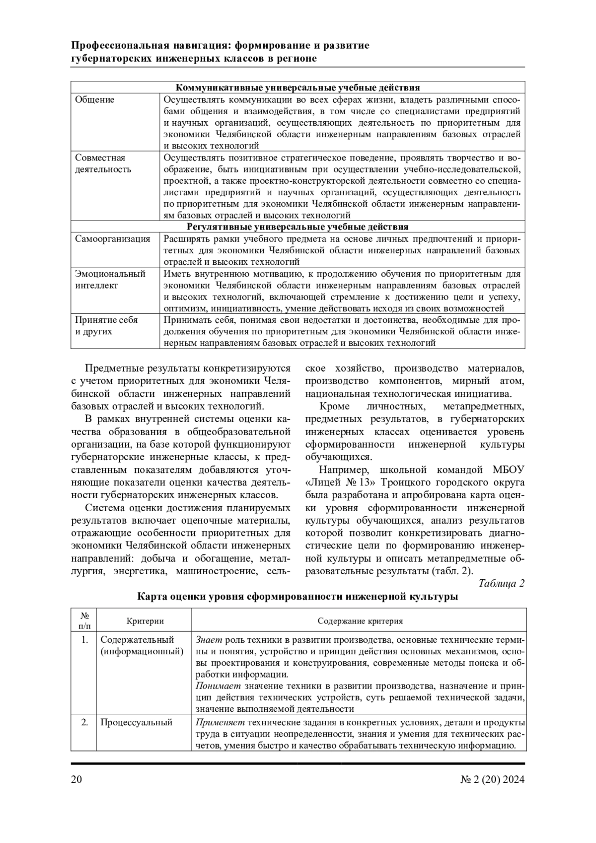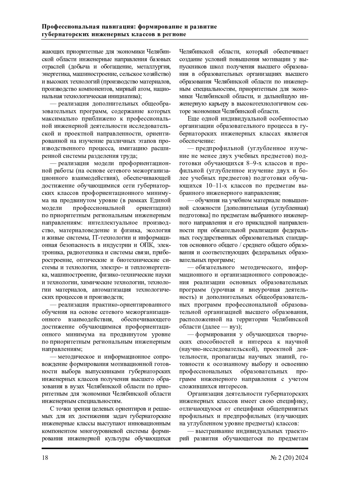 В статье актуализирована задача формирования инженерной культуры и развития инженерного образования обучающихся общеобразовательных организаций Челябинской области. Представлена краткая характеристика модели формирования и развития губернаторских инженерных классов. Раскрыто содержание работы губернаторских инженерных классов. Определены направления развития инженерного образования в системе образования Челябинской области.