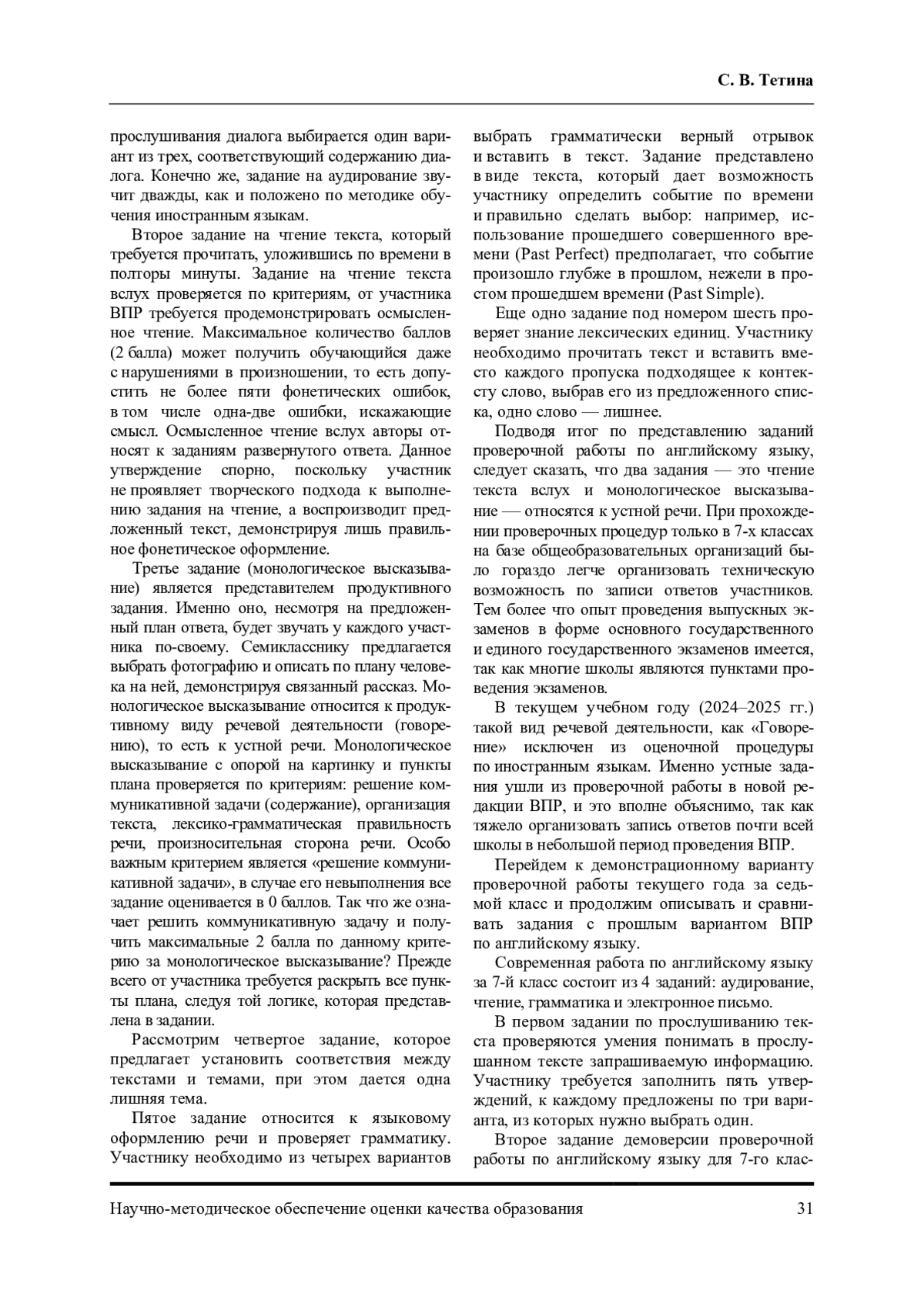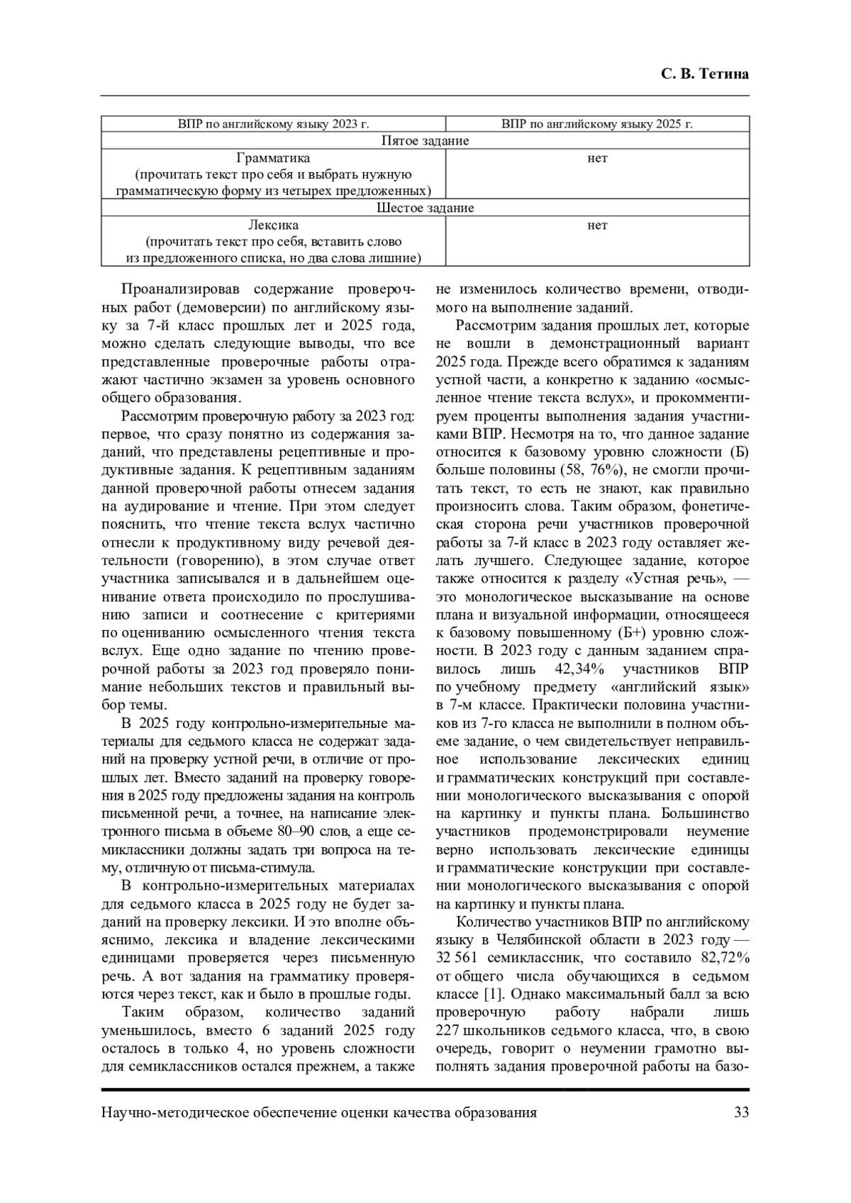 Актуализируется проблема возрастающей роли всероссийских проверочных работ по иностранным языкам, в частности, по английскому языку. Названы причины изменения контрольно-измерительных материалов проверочной работы по английскому языку. Автор дает объяснения о непроведении проверочных работ по учебному предмету «иностранный язык» в 2024 году. Подробно представлены изменения в содержании заданий проверочной работы по английскому языку на примере демоверсии 2025 года контрольно-измерительного материала для 7-го класса. Выявлены особенности контроля продуктивных видов заданий проверочной работы за 7-й класс. В статье демонстрируется сравнительная таблица заданий по английскому языку седьмого класса в динамике изменений. Приведены цифры по количеству участников из 7-го класса в написании проверочной работы в 2023 году и в процентах представлены результаты неуспеха в говорении, а именно в чтении текста вслух и в монологическом высказывании.