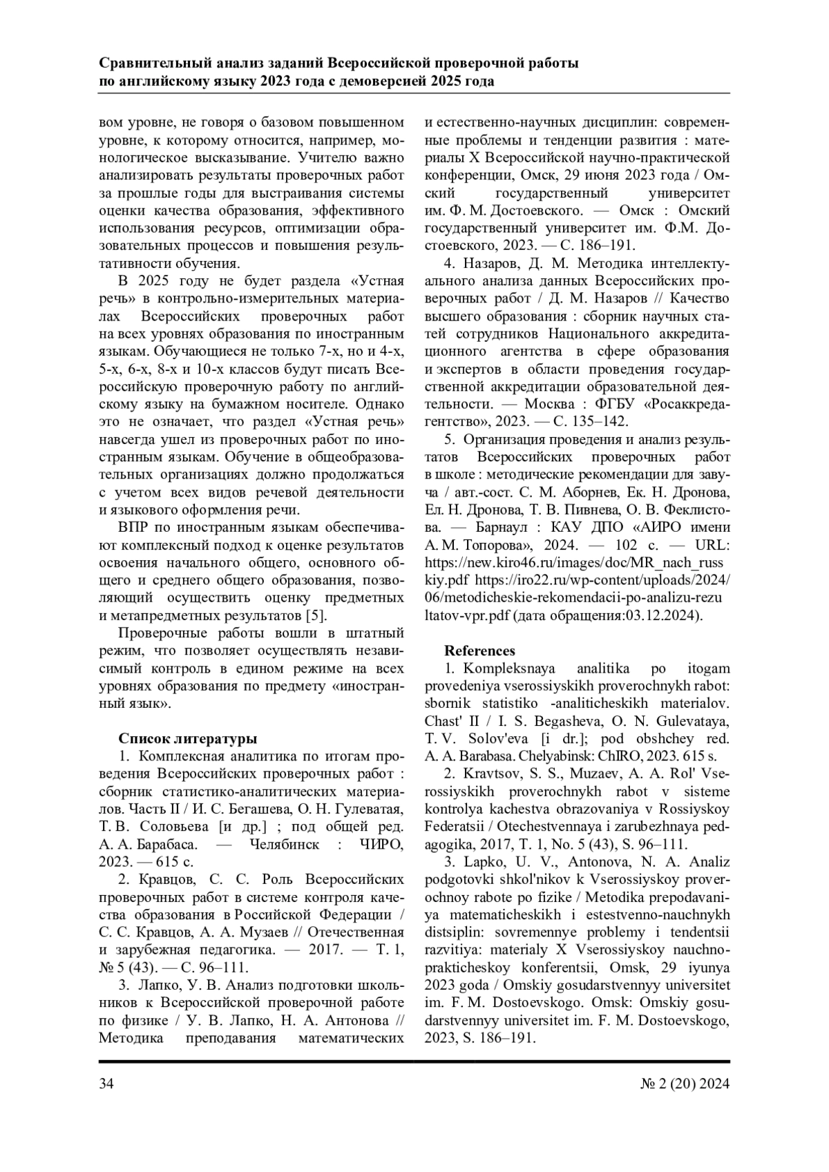 2. Кравцов, С. С. Роль Всероссийских проверочных работ в системе контроля качества образования в Российской Федерации / С. С. Кравцов, А. А. Музаев // Отечественная и зарубежная педагогика. - 2017. - Т. 1, № 5 (43). - С. 96-111. EDN: ZRCFBT