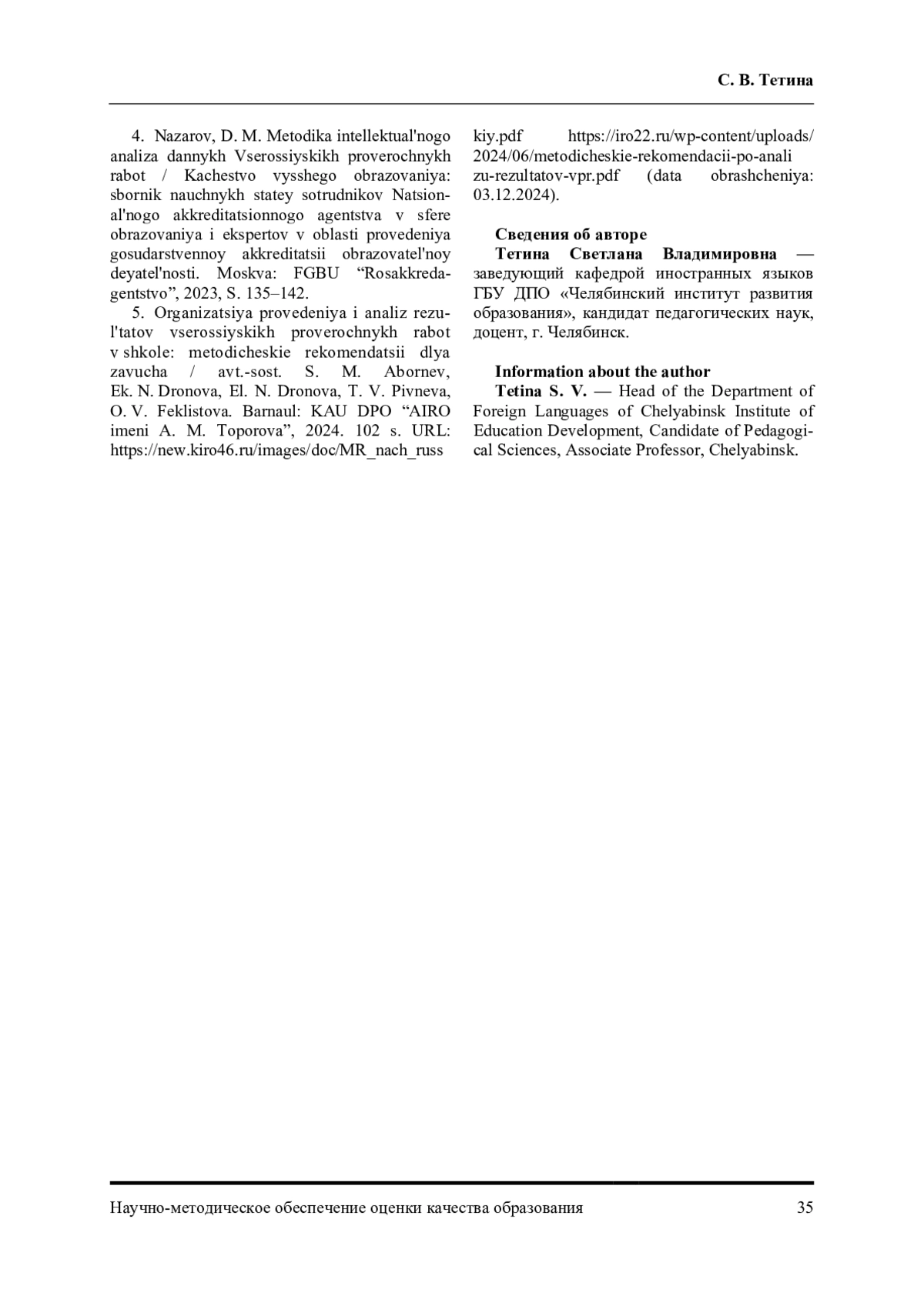 4. Назаров, Д. М. Методика интеллектуального анализа данных Всероссийских проверочных работ / Д. М. Назаров // Качество высшего образования: сборник научных статей сотрудников Национального аккредитационного агентства в сфере образования и экспертов в области проведения государственной аккредитации образовательной деятельности. - Москва: ФГБУ “Росаккредагентство”, 2023. - С. 135-142. EDN: TTLDZF