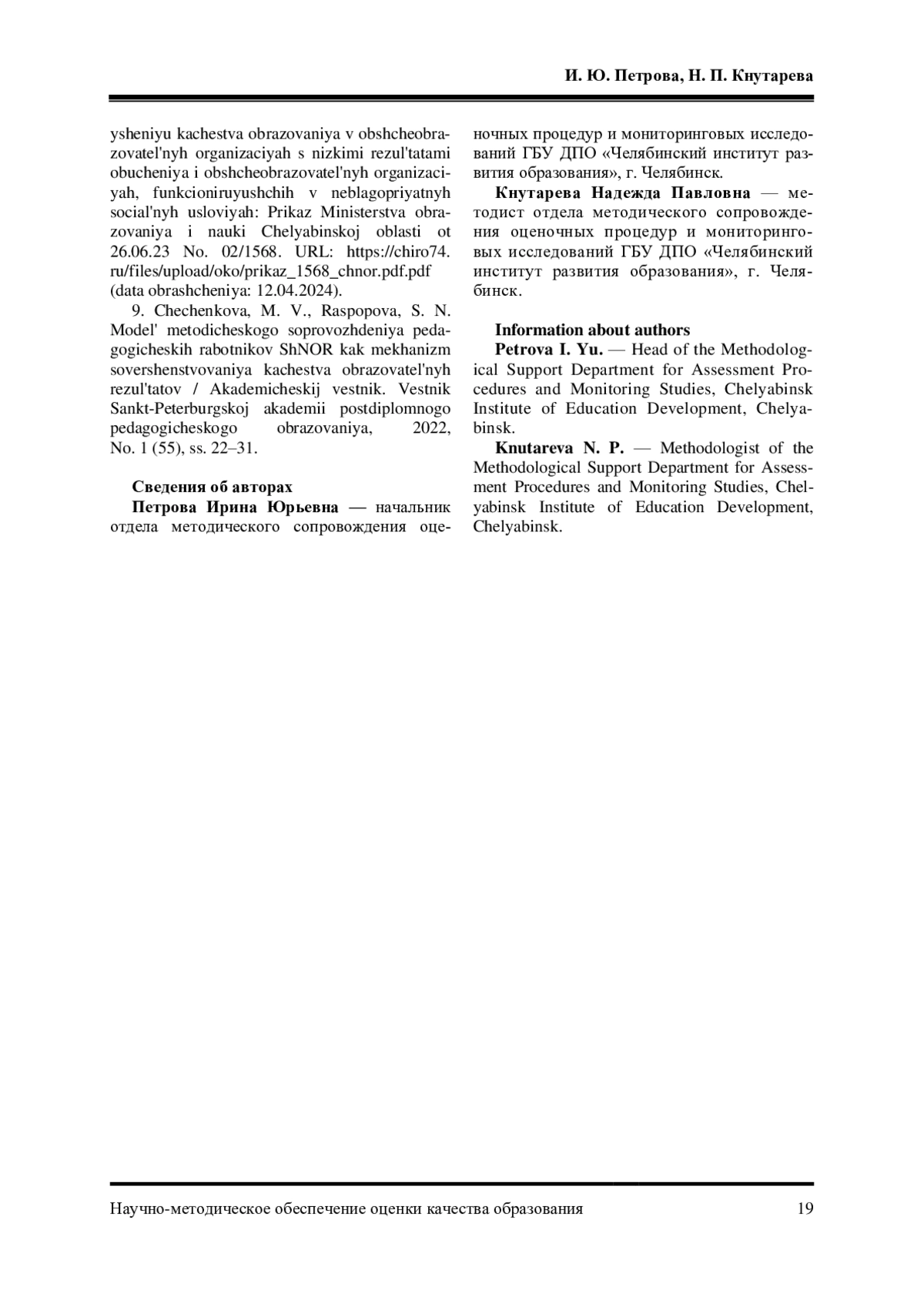 9. Чеченкова, М. В. Модель методического сопровождения педагогических работников ШНОР как механизм совершенствования качества образовательных результатов / М. В. Чеченкова, С. Н. Распопова // Академический вестник. Вестник Санкт-Петербургской академии постдипломного педагогического образования. - 2022. - № 1 (55). - С. 22-31. EDN: KRKAQE