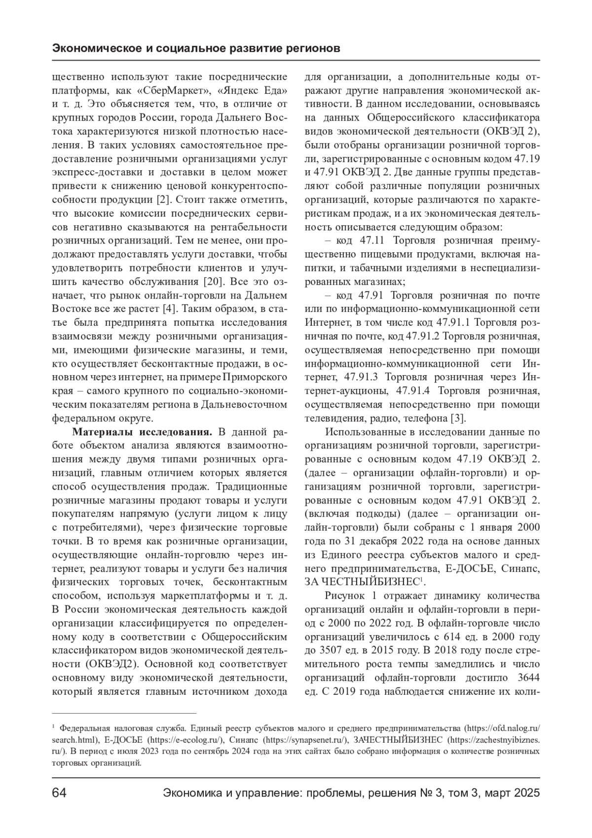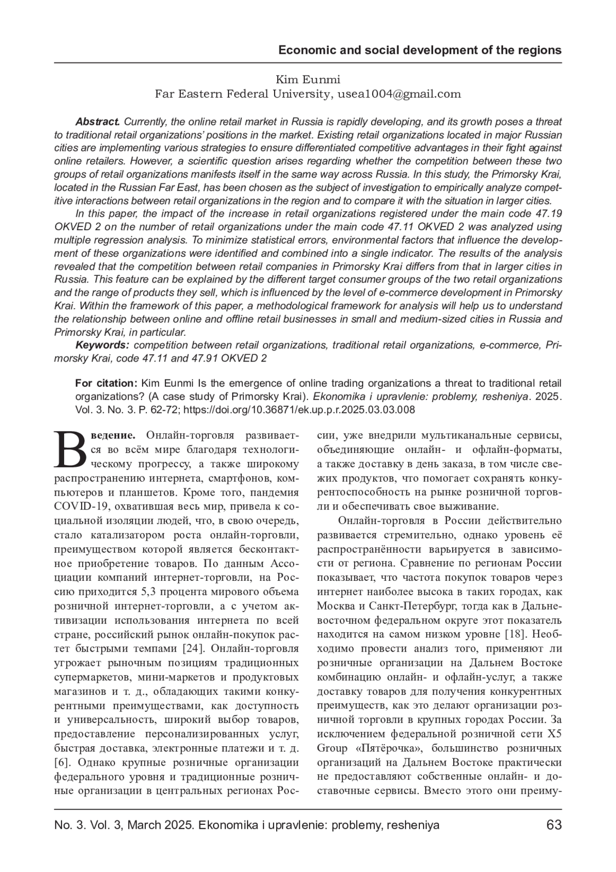 ЫНМИ К. ЯВЛЯЕТСЯ ЛИ ПОЯВЛЕНИЕ ОРГАНИЗАЦИЙ ОНЛАЙН-ТОРГОВЛИ УГРОЗОЙ ДЛЯ ТРАДИЦИОННЫХ ОРГАНИЗАЦИЙ РОЗНИЧНОЙ ТОРГОВЛИ? (НА ПРИМЕРЕ ПРИМОРСКОГО КРАЯ) // ЭКОНОМИКА И УПРАВЛЕНИЕ: ПРОБЛЕМЫ, РЕШЕНИЯ. 2025. ТОМ 3 № 3
