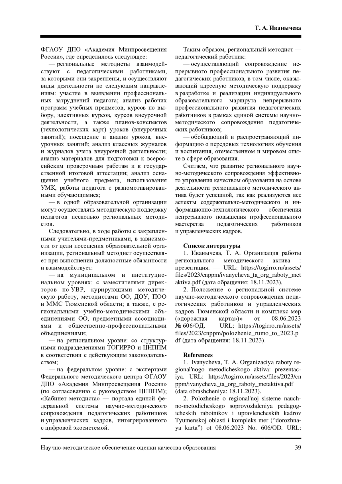 . Иванычева, Т. А. Организация работы регионального методического актива: презентация. - URL: https://togirro.ru/assets/files/2023/cnppm/ivanycheva_ta_org_raboty_metaktiva.pdf(дата обращения: 18.11.2023).