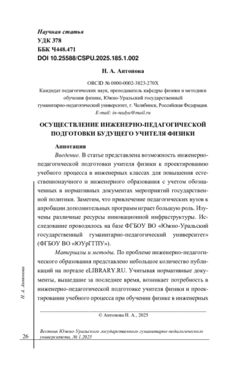 Введение. В статье представлена возможность инженерно-педагогической подготовки учителя физики к проектированию учебного процесса в инженерных классах для повышения естественнонаучного и инженерного образования с учетом обозначенных в нормативных документах мероприятий государственной политики. Заметим, что привлечение педагогических вузов к апробации дополнительных программ играет большую роль. Изучены различные ресурсы инновационной инфраструктуры. Исследование проводилось на базе ФГБОУ ВО «Южно-Уральский государственный гуманитарно-педагогический университет» (ФГБОУ ВО «ЮУрГГПУ»).