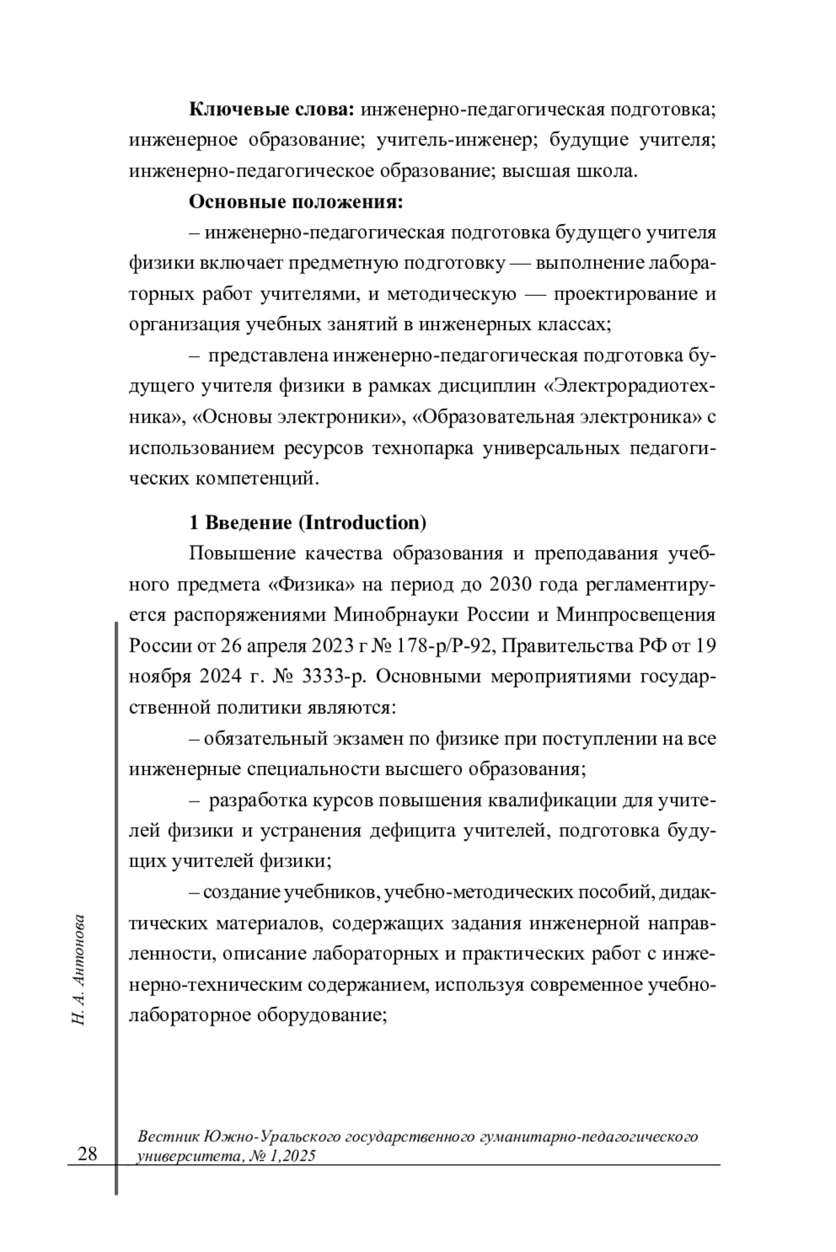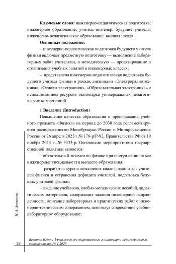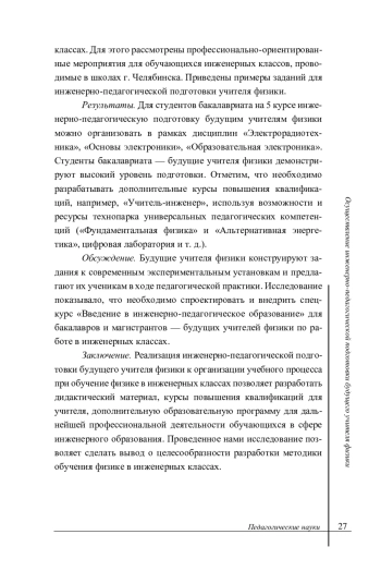 Результаты. Для студентов бакалавриата на 5 курсе инженерно-педагогическую подготовку будущим учителям физики можно организовать в рамках дисциплин «Электрорадиотехника», «Основы электроники», «Образовательная электроника». Студенты бакалавриата - будущие учителя физики демонстрируют высокий уровень подготовки. Отметим, что необходимо разрабатывать дополнительные курсы повышения квалификаций, например, «Учитель-инженер», используя возможности и ресурсы технопарка универсальных педагогических компетенций («Фундаментальная физика» и «Альтернативная энергетика», цифровая лаборатория и т. д.). Обсуждение. Будущие учителя физики конструируют задания к современным экспериментальным установкам и предлагают их ученикам в ходе педагогической практики. Исследование показывало, что необходимо спроектировать и внедрить спецкурс «Введение в инженерно-педагогическое образование» для бакалавров и магистрантов - будущих учителей физики по работе в инженерных классах.