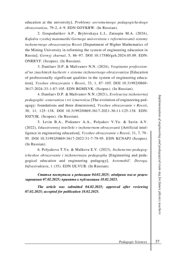 3. Данилаев Д. П., Маливанов Н. Н. Воспитание профессионально значимых качеств в системе инженерного образования // Высшее образование в России. 2024. Т. 33, № 1. С. 87-105. 10.31992/0869-3617-2024-33-1-87-105. (Scopus). DOI: 10.31992/0869-3617-2024-33-1-87-105.Scopus EDN: BGMXVK
