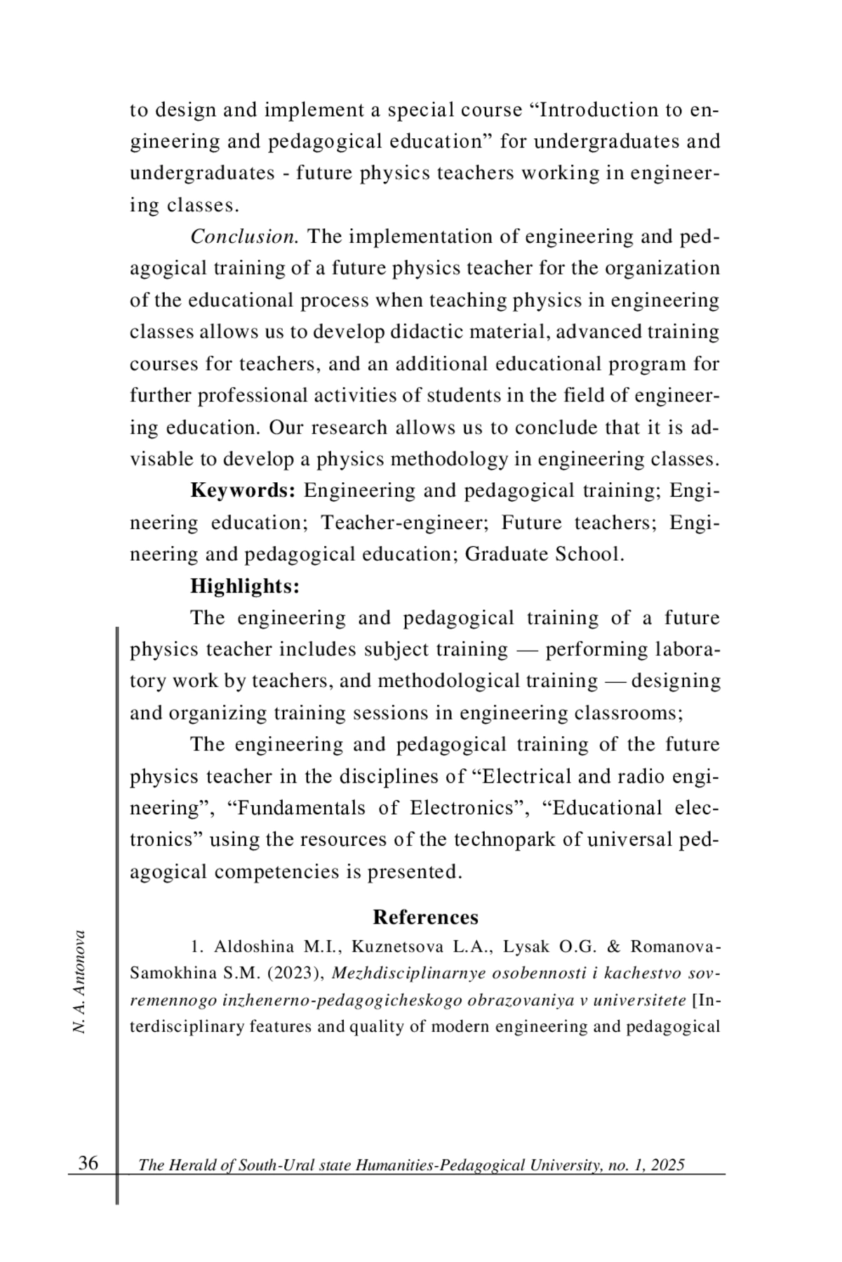 1. Алдошина М. И., Кузнецова Л. А., Лысак О. Г., Романова-Самохина С. М. Междисциплинарные особенности и качество современного инженерно-педагогического образования в университете // Проблемы современного педагогического образования. 2023. № 79-2. С. 4-9. EDN: GOYKRW