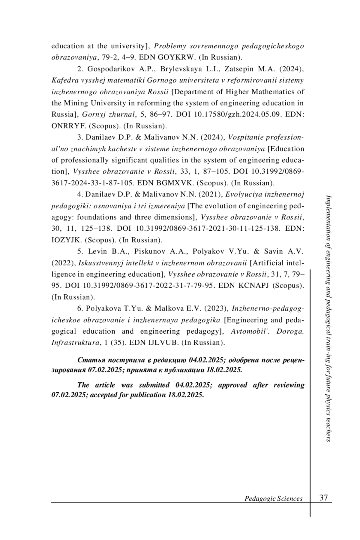 6. Полякова Т. Ю., Малькова Е. В. Инженерно-педагогическое образование и инженерная педагогика // Автомобиль. Дорога. Инфраструктура. 2023. № 1 (35). EDN: IJLVUB