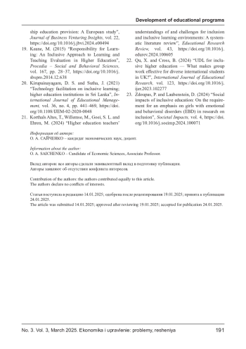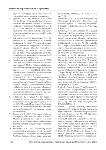 15. Bodhi R., Singh T., Joshi Y., Sangroya D. Impact of psychological factors, university environment and sustainable behaviour on teachers’ intention to incorporate inclusive education in higher education // International Journal of Educational Management. - 2021. - Vol. 36, № 4. - P. 381396. DOI: 10.1108/IJEM-02-2020-0113