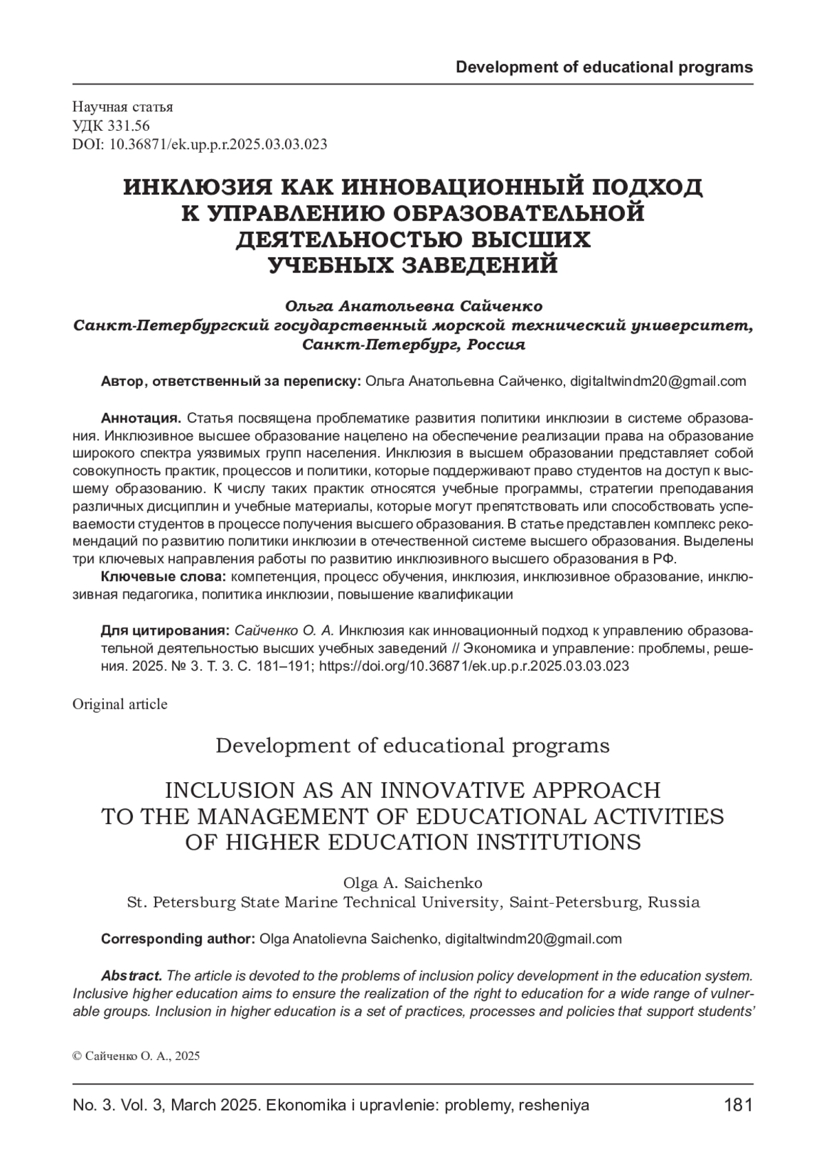2. Бижукова К. А., Горбунова В. В., Шульга М. М., Колесникова И. А., Бруснева В. В. Формирование модели инклюзивного пространства в системе высшего профессионального образования // Социология. - 2022. - № - С. 339-346. URL: https://cyberleninka.ru/article/n/formirovanie-modeli-inklyuzivnogo-prostranstva-v-sisteme-vysshego-professionalnogo-obrazovaniya.