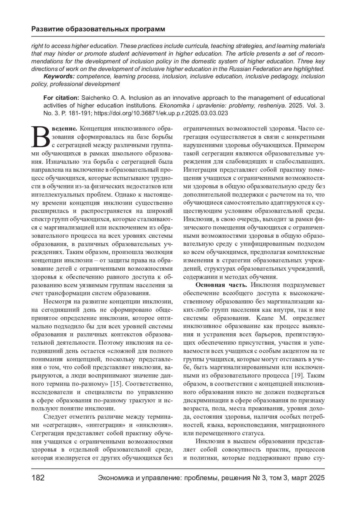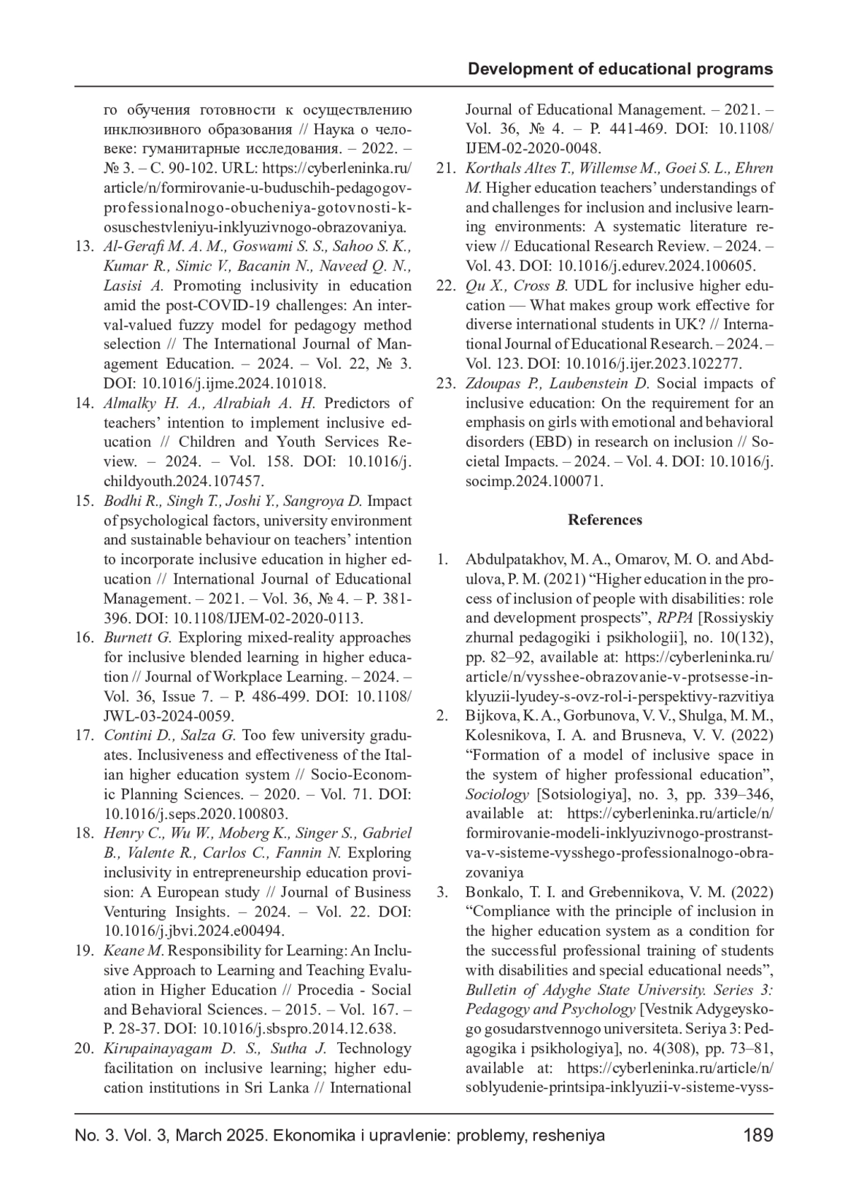 14. Almalky H. A., Alrabiah A. H. Predictors of teachers’ intention to implement inclusive education // Children and Youth Services Review. - 2024. - Vol. 158. DOI: 10.1016/j.childyouth.2024.107457 EDN: EMARNC