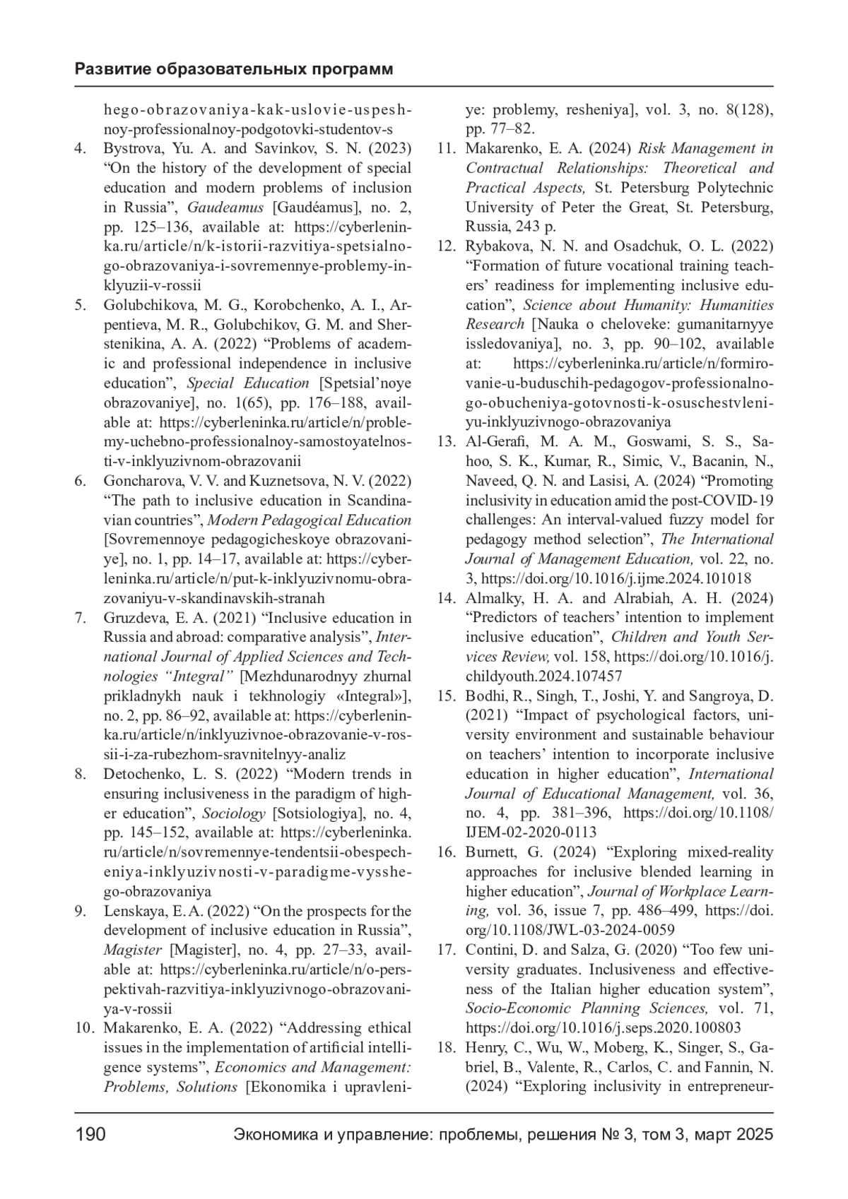 3. Бонкало Т. И., Гребенникова В. М. Соблюдение принципа инклюзии в системе высшего образования как условие успешной профессиональной подготовки студентов с инвалидностью и ОВЗ // Вестник Адыгейского государственного университета. Серия 3: Педагогика и психология. - 2022. - № 4 (308). - С. 7381. URL: https://cyberleninka.ru/article/n/soblyudenie-printsipa-inklyuzii-v-sistemevysshego-obrazovaniya-kak-uslovie-uspeshnoyprofessionalnoy-podgotovki-studentov-s. EDN: BLFEIJ