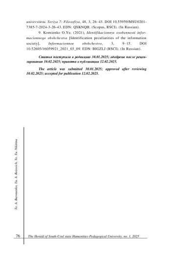 9. Корниенко О. Ю. Идентификационные особенности информационного общества // Информационное общество. 2021. № 3. С. 9-15. 10.52605/16059921_2021_03_09. (RSCI). DOI: 10.52605/16059921_2021_03_09.RSCI EDN: BIGZLJ