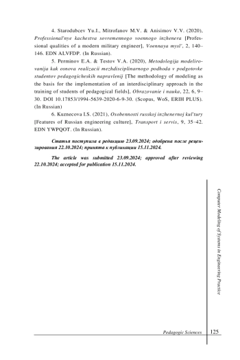 Заключение. Расширение кругозора и умений будущих учителей-предметников, углубление их знаний в области инженерной деятельности и моделирования гарантируют создание фундамента инженерной проектной деятельности школьников. Для эффективной работы по специальности будущему учителю необходимы знания во многих сферах практической деятельности, в том числе и в инженерной сфере. Это требует постоянного обновления содержания учебного курса «Компьютерное моделирование». Основные положения: - установлены подходы к формированию инженерной культуры и разработаны мероприятия в рамках курса «Компьютерное моделирование» по направлению 44.03.05 «Педагогическое образование», также по направлению 09.03.02 «Информационные системы и технологии» в рамках курса «Моделирование систем» с целью обновления содержания курсов; - определены основные методические и научно-технические особенности моделирования систем в инженерной и педагогической практике, такие как системный подход, моделирование структуры системы, блочно-иерархический метод построения моделей сложных систем, построение и анализ причинно-следственных и структурных моделей, имитационное моделирование, использование современного программного обеспечения.