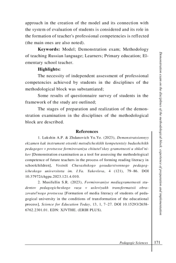 Заключение. Отражена система подготовки и проведения демонстрационного экзамена по дисциплинам методического блока и обоснована профессиональная направленность внедрения этой формы оценивания в систему независимой оценки профессиональных компетенций будущих учителей начальных классов. Рассмотрена роль информационно-деятельностного подхода при проектировании модели и его связи с системой оценивания обучающихся, отражена его роль в формировании профессиональных компетенций педагога. Основные положения: - обоснована необходимость независимой оценки достигнутых студентами профессиональных компетенций по дисциплинам методического блока; - обозначены некоторые результаты анкетирования обучающихся в рамках исследования; - описаны этапы подготовки и проведения демонстрационного экзамена по дисциплинам методического блока.