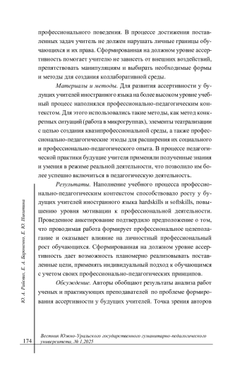 Материалы и методы. Для развития ассертивности у будущих учителей иностранного языка на более высоком уровне учебный процесс наполнялся профессионально-педагогическим контекстом. Для этого использовались такие методы, как метод конк-ретных ситуаций (работа в микрогруппах), элементы театрализации с целью создания квазипрофессиональной среды, а также профессионально-педагогические этюды для расширения их социального и профессионально-педагогического опыта. В процессе педагогической практики будущие учителя применяли полученные знания и умения в режиме реальной деятельности, что позволило им более успешно включиться в педагогическую деятельность.