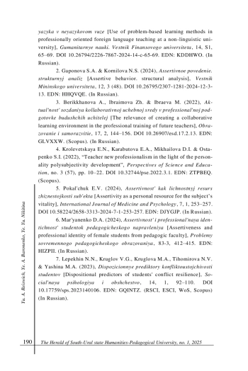 РАЙСВИХ Ю. А., БАРОНЕНКО Е. А., НИКИТИНА Е. Ю. АССЕРТИВНОСТЬ КАК СРЕДСТВО ОПТИМИЗАЦИИ ИНОЯЗЫЧНОЙ ПОДГОТОВКИ БУДУЩИХ УЧИТЕЛЕЙ // ВЕСТНИК ЮЖНО-УРАЛЬСКОГО ГОСУДАРСТВЕННОГО ГУМАНИТАРНО-ПЕДАГОГИЧЕСКОГО УНИВЕРСИТЕТА. 2025. № 1 (185)