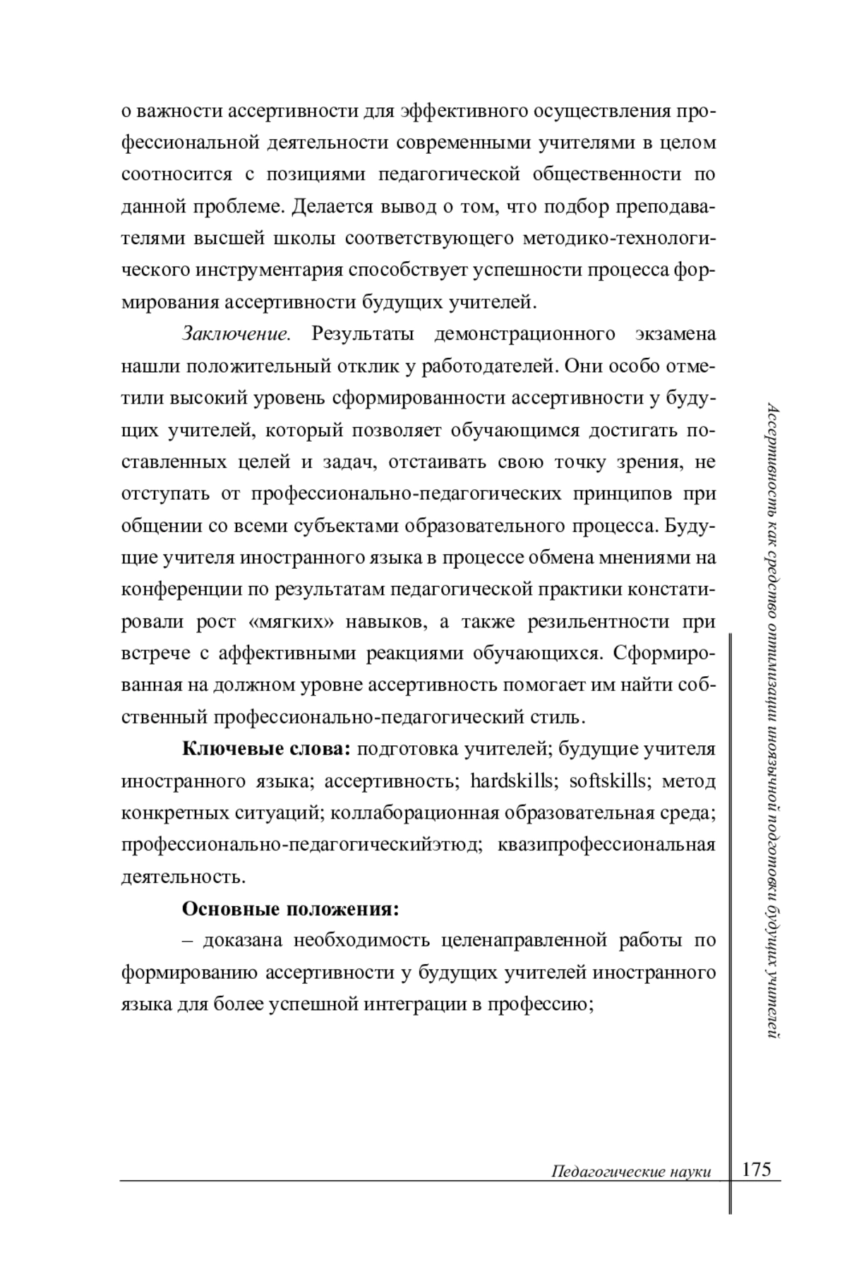 Заключение. Результаты демонстрационного экзамена нашли положительный отклик у работодателей. Они особо отметили высокий уровень сформированности ассертивности у будущих учителей, который позволяет обучающимся достигать поставленных целей и задач, отстаивать свою точку зрения, не отступать от профессионально-педагогических принципов при общении со всеми субъектами образовательного процесса. Будущие учителя иностранного языка в процессе обмена мнениями на конференции по результатам педагогической практики констатировали рост «мягких» навыков, а также резильентности при встрече с аффективными реакциями обучающихся. Сформированная на должном уровне ассертивность помогает им найти собственный профессионально-педагогический стиль. Основные положения: - доказана необходимость целенаправленной работы по формированию ассертивности у будущих учителей иностранного языка для более успешной интеграции в профессию; - выявлено, что наполнение учебного процесса профессионально-педагогическим контекстом позволяет будущим учителям иностранного языка ставить цели и планомерно достигать их, не допуская манипуляций со стороны других субъектов образовательного процесса; - определены преимущества метода конкретных ситуаций, элементов театрализации и профессионально-педагогических этюдов для создания квазипрофессиональной деятельности.