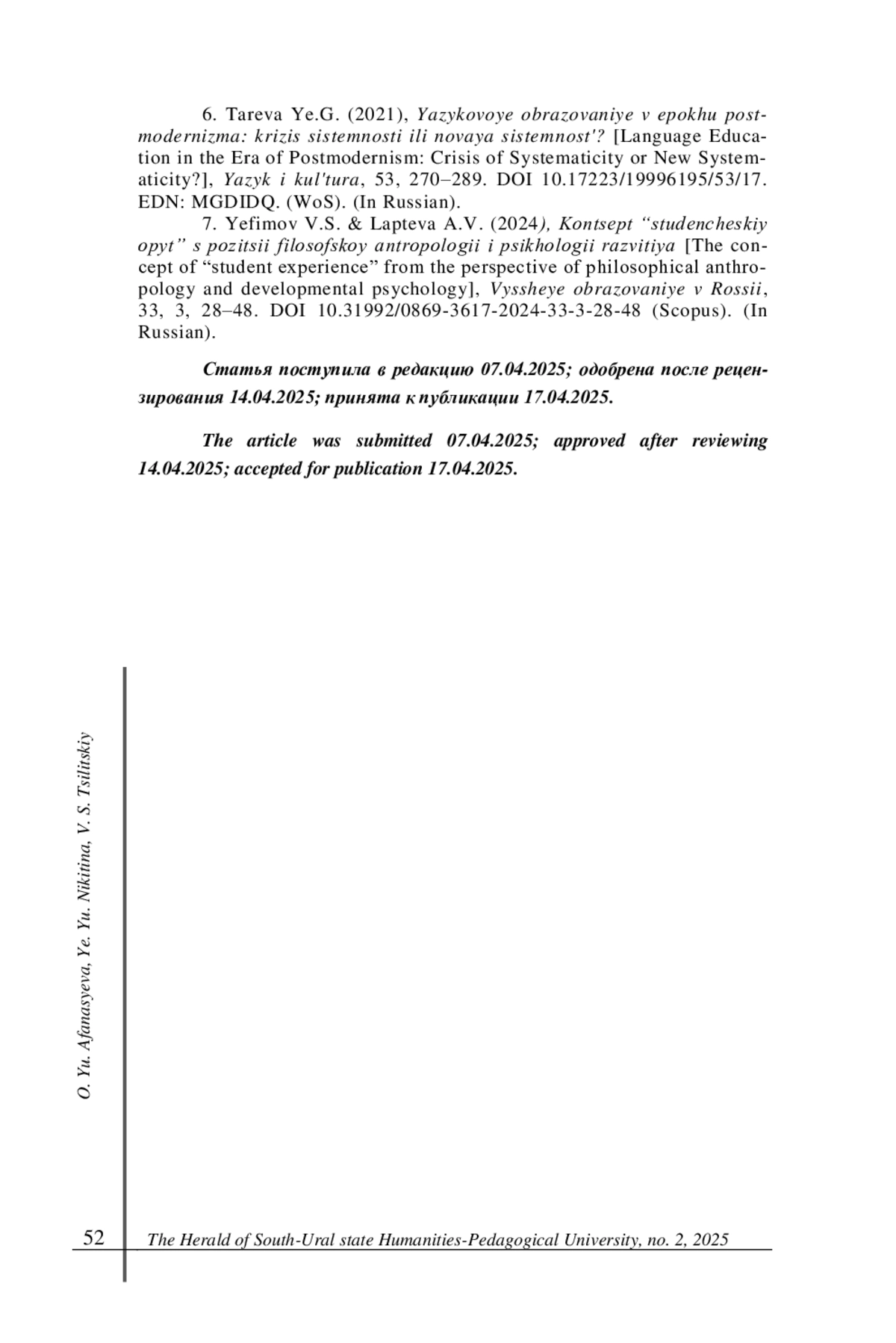 7. Ефимов В.С., Лаптева А.В. Концепт “студенческий опыт” с позиции философской антропологии и психологии развития // Высшее образование в России. 2024. Т. 33, № 3. С. 28-48. 10.31992/0869-3617-2024-33-3-28-48 (Scopus). DOI: 10.31992/0869-3617-2024-33-3-28-48(Scopus) EDN: RNTLKL