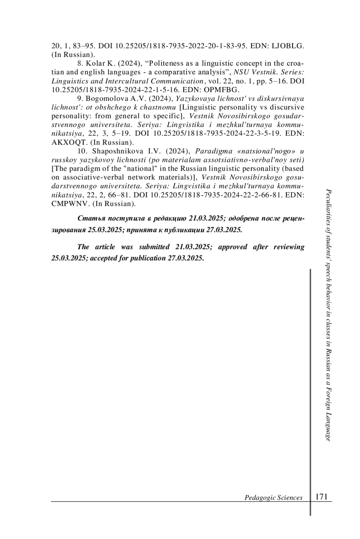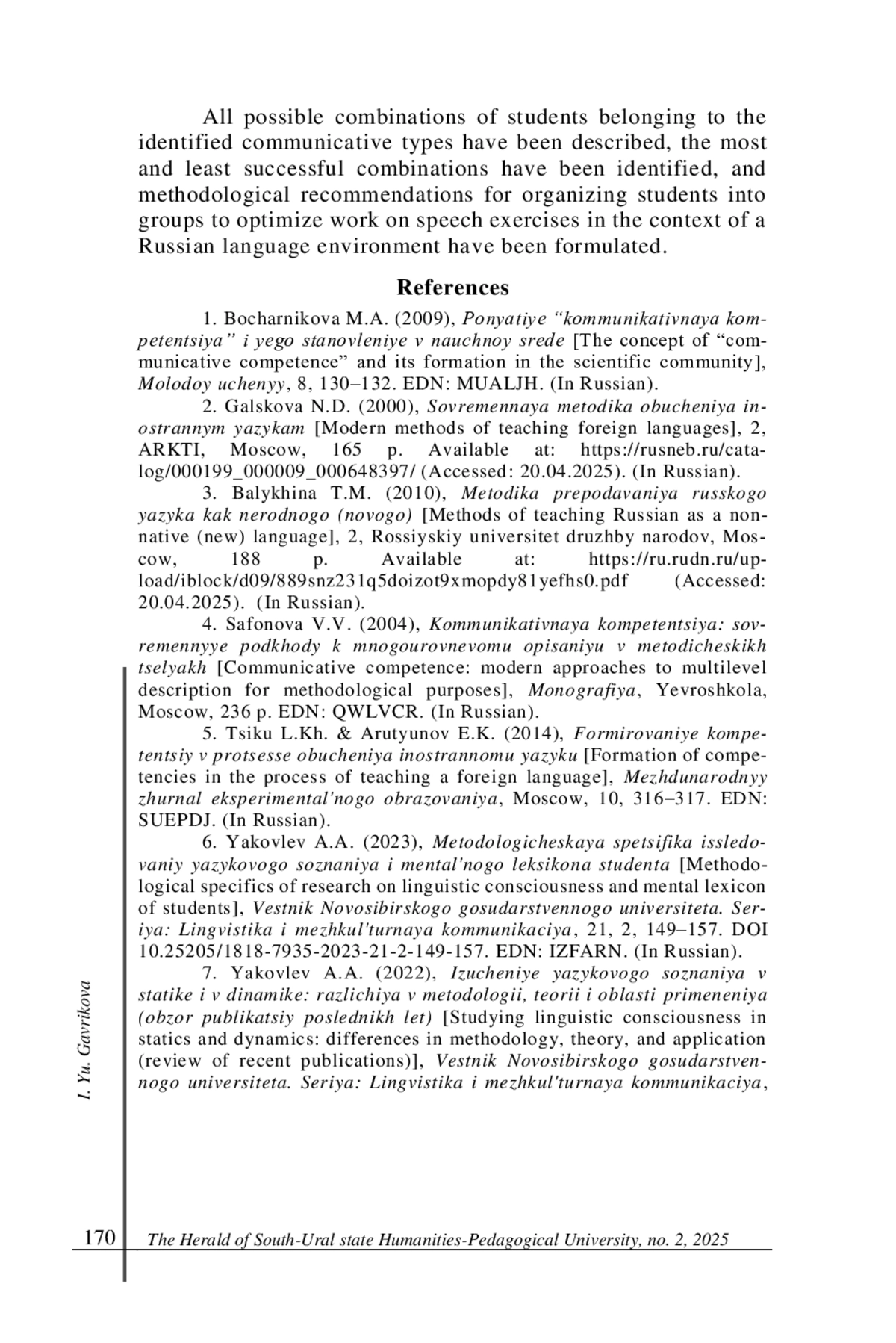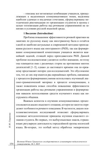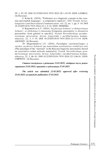 ГАВРИКОВА И. Ю. ОСОБЕННОСТИ РЕЧЕВОГО ПОВЕДЕНИЯ УЧАЩИХСЯ НА ЗАНЯТИЯХ ПО РУССКОМУ ЯЗЫКУ КАК ИНОСТРАННОМУ // ВЕСТНИК ЮЖНО-УРАЛЬСКОГО ГОСУДАРСТВЕННОГО ГУМАНИТАРНО-ПЕДАГОГИЧЕСКОГО УНИВЕРСИТЕТА. 2025. № 2 (186)