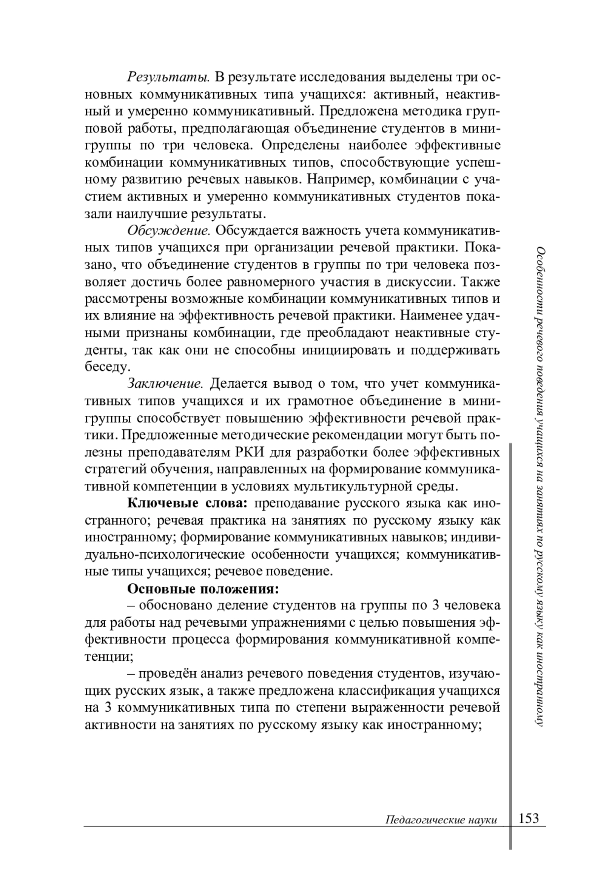 Ключевые фразы: преподавание русского языка как иностранного, речевая практика на занятиях по русскому языку как иностранному, формирование коммуникативных навыков, индивидуально-психологические особенности учащихся, коммуникативные типы учащихся, речевое поведение