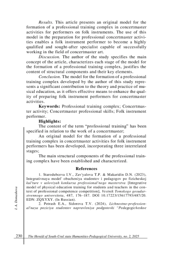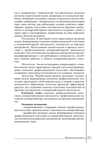 Заключение. Разработанная автором настоящего исследования модель формирования комплекса профессиональной подготовки представляет собой важный вклад в теорию и практику музыкального образования, поскольку предлагает эффективные средства для улучшения качества подготовки исполнителей на народных инструментах к концертмейстерской деятельности. Основные положения: - конкретизировано содержание понятия «профессиональная подготовка» применительно к деятельности концертмейстера; - разработана авторская модель формирования комплекса профессиональной подготовки в концертмейстерской деятельности исполнителя на народных инструментах, включающая три взаимосвязанные этапа; - установлены и охарактеризованы основные структурные компоненты комплекса профессиональной подготовки.