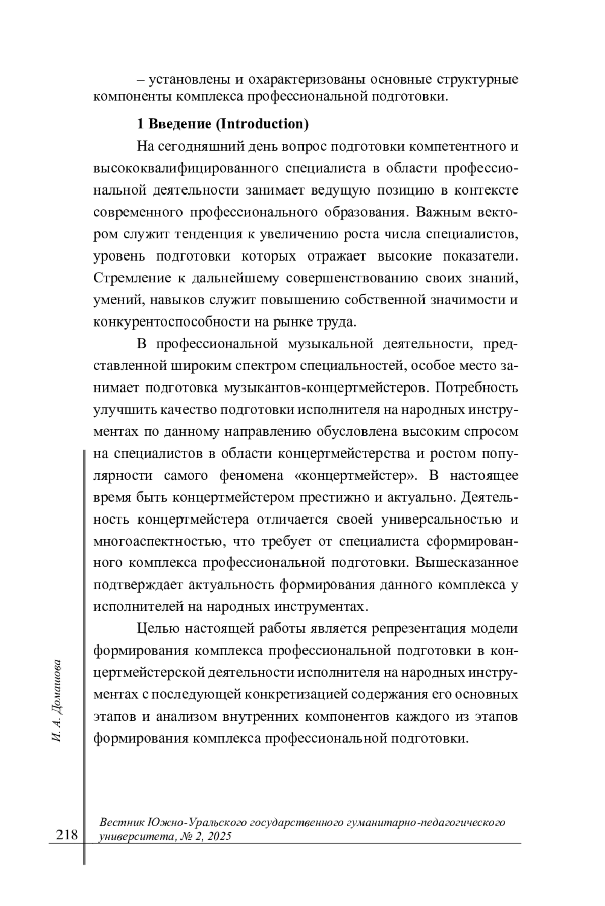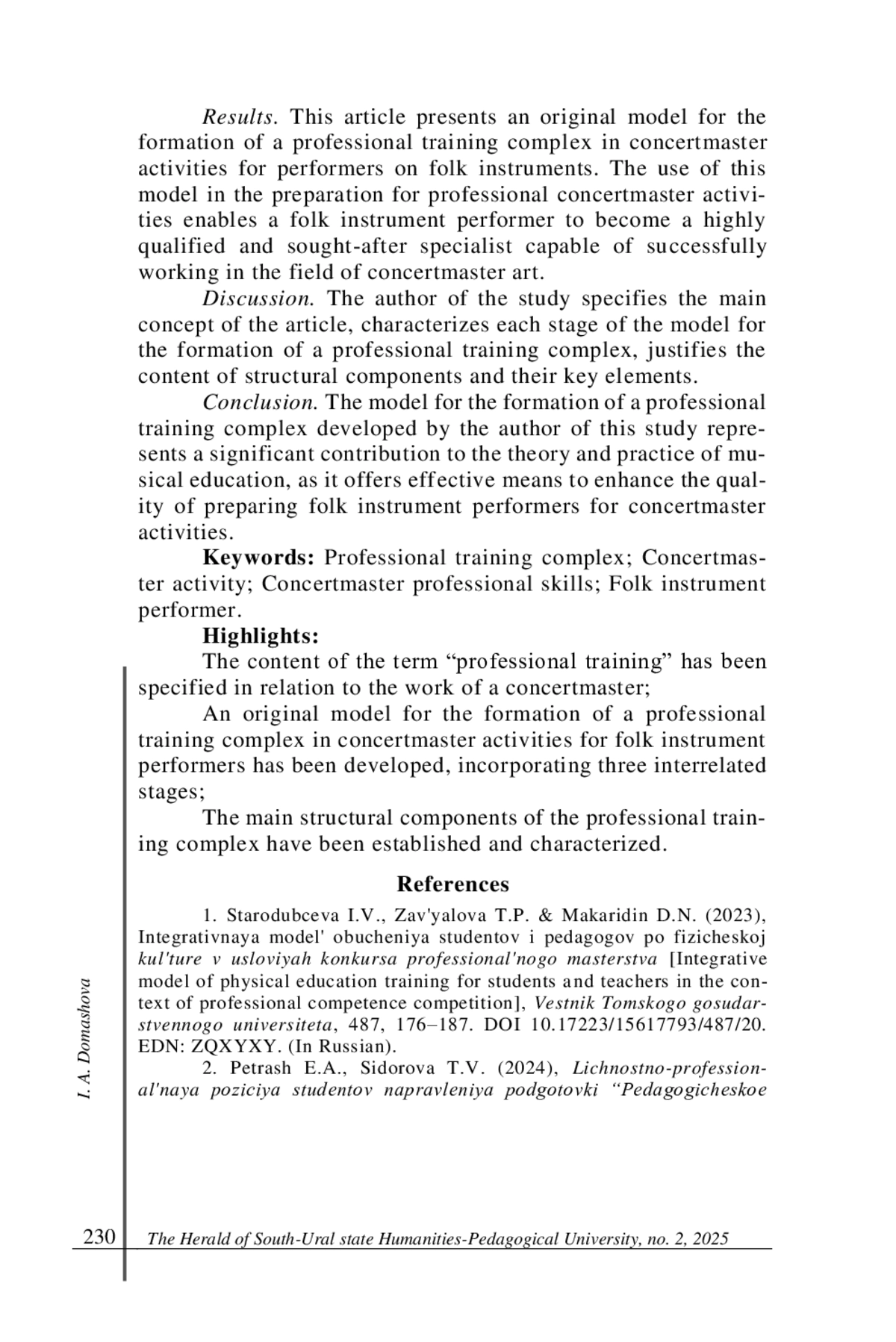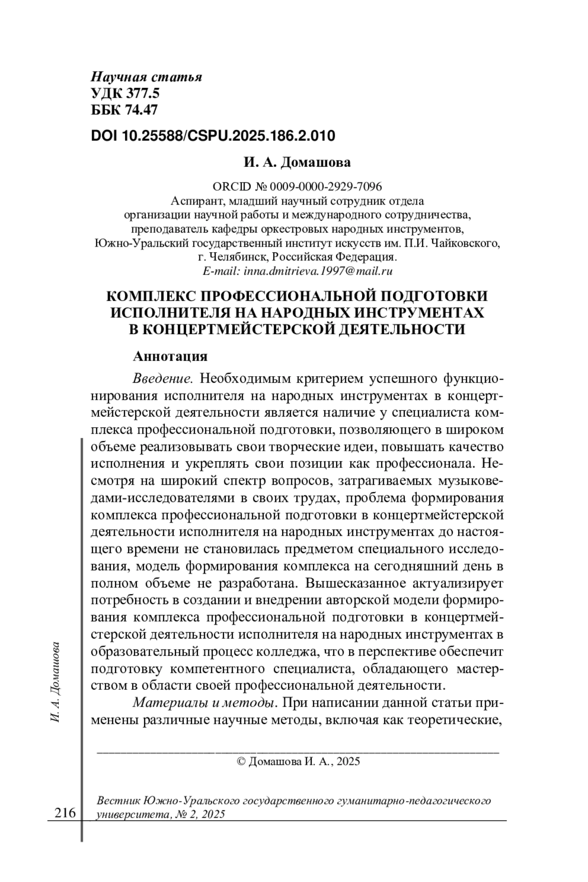 ДОМАШОВА И. А. КОМПЛЕКС ПРОФЕССИОНАЛЬНОЙ ПОДГОТОВКИ ИСПОЛНИТЕЛЯ НА НАРОДНЫХ ИНСТРУМЕНТАХ В КОНЦЕРТМЕЙСТЕРСКОЙ ДЕЯТЕЛЬНОСТИ // ВЕСТНИК ЮЖНО-УРАЛЬСКОГО ГОСУДАРСТВЕННОГО ГУМАНИТАРНО-ПЕДАГОГИЧЕСКОГО УНИВЕРСИТЕТА. 2025. № 2 (186)